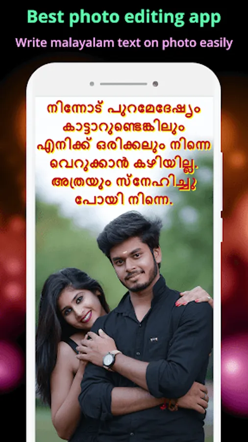 Write Malayalam Text On Photo give opportunity to write Malayalam love poetry, Malayalam poems, Malayalam gazals and Malayalam shayari on photo by Malayalam typing on photo app.also you can select best quotes from different categories of quotes like friends quotes, attitude quotes, inspirational quotes, love quotes etc.in Malayalam language and set on your photo.