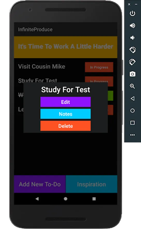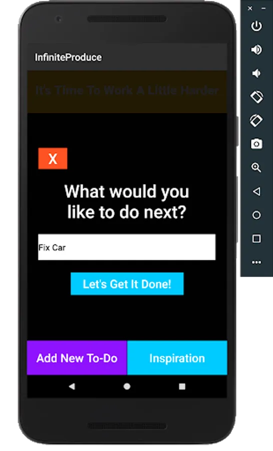 Add new stuff to do, edit it later, add notes to it, reshuffle the order, delete items or mark them as done! Need some inspiration to work? We've got a button for that!