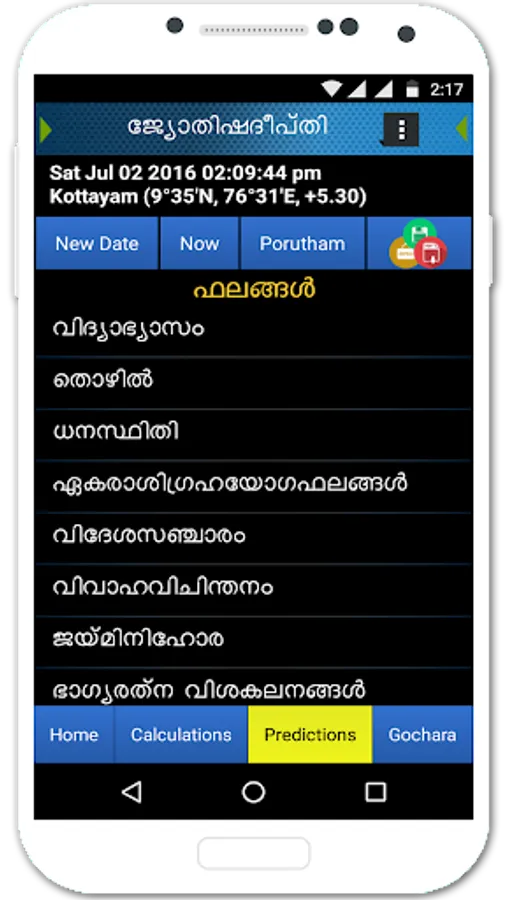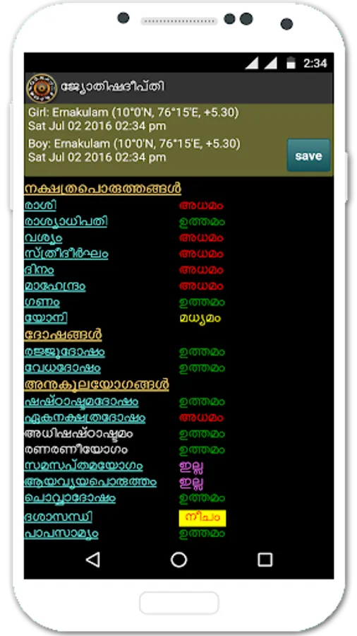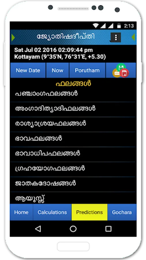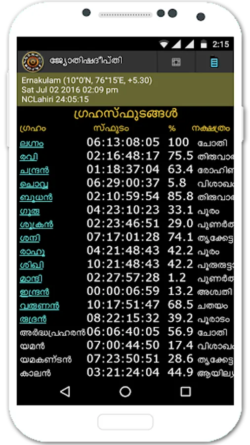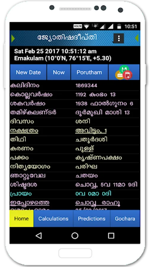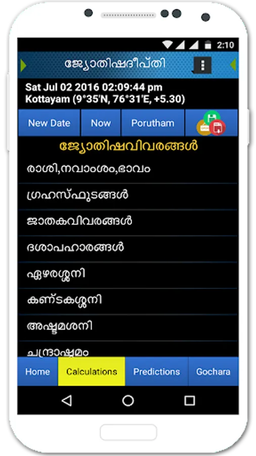 JyothishaDeepthi Malayalam is a Vedic Astrology Software for those interested in Kerala Astrology with Horoscope, Almanac (Panchangam), Transit/Star/Rise/Set Tables, Malayalam Calendar, Matrimonial Match (Porutham). This Software is suitable for those who are interested in or practicing Astrology.This Malayalam Astrology Android App provides 200 years, Saka and Malayalam Calendars, Monthly Almanac (Panchangam), Horoscope (Jathakam), Matrimonial compatibility and many more calculations specially developed for Astrologers. JyothishaDeepthi Panchangam is one among the trusted astrology software in South India.