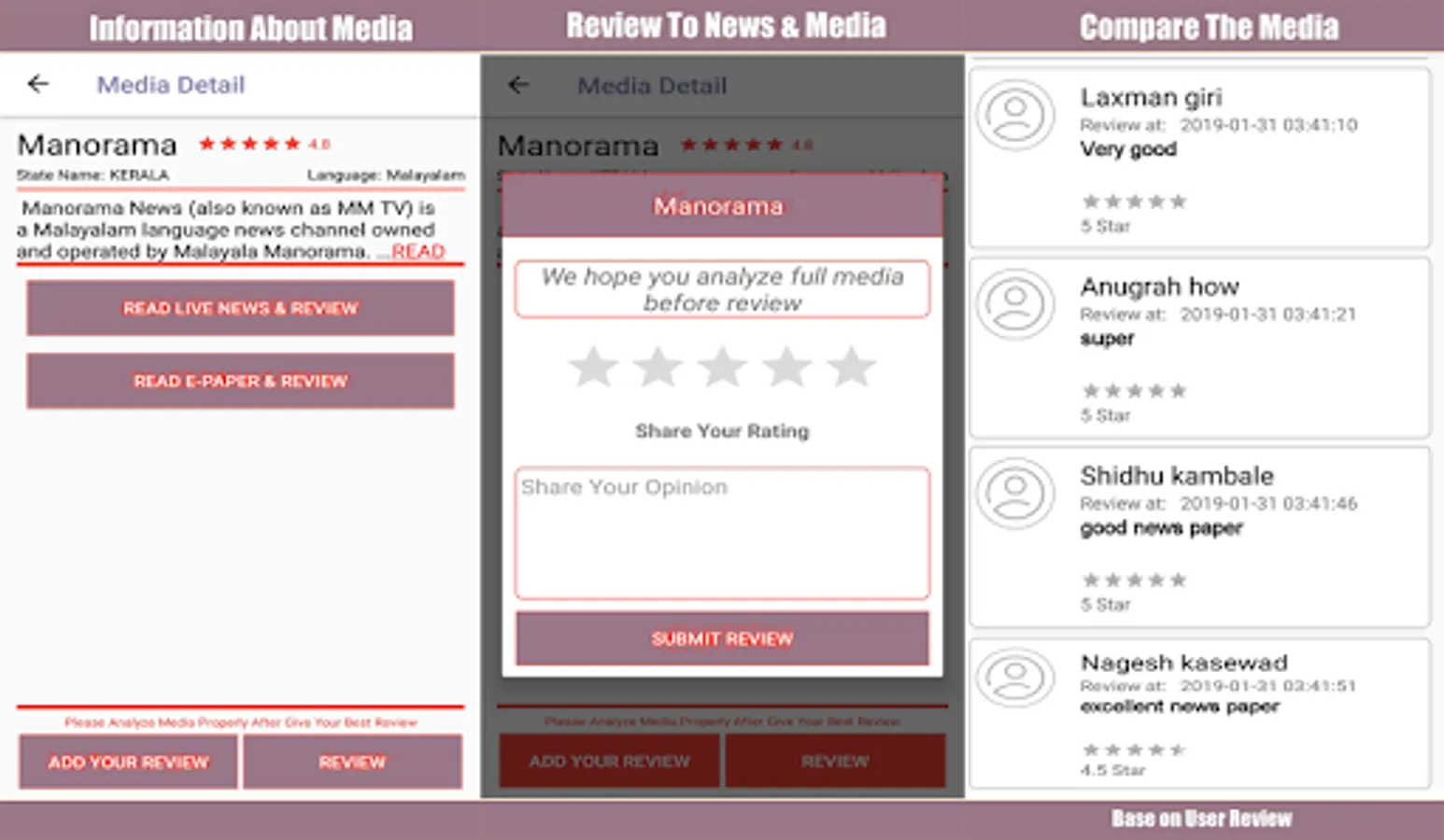 App Is providing the user review audit and rating system, User Can Upload the media and News and others will provide his opinion and rating on News and media with the rating.