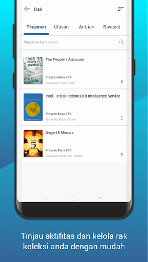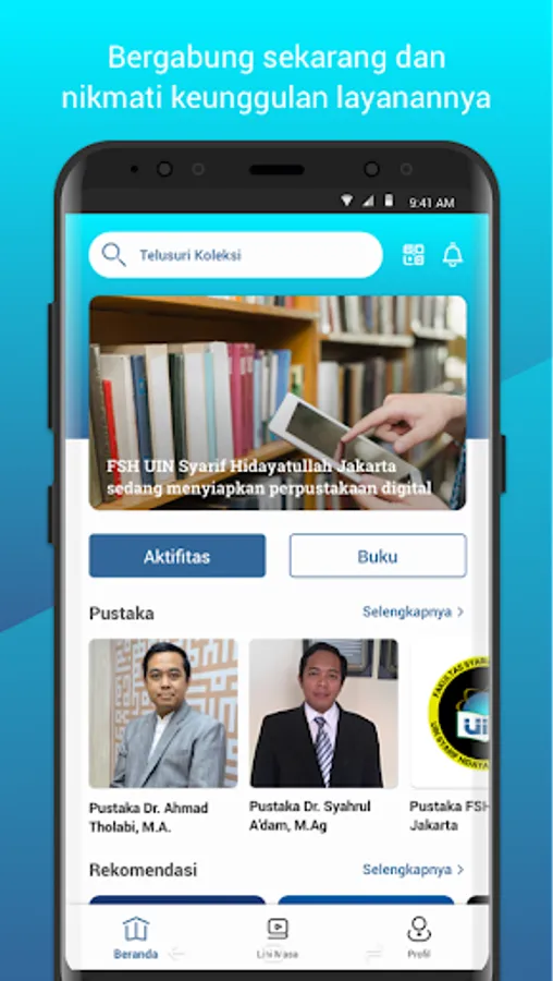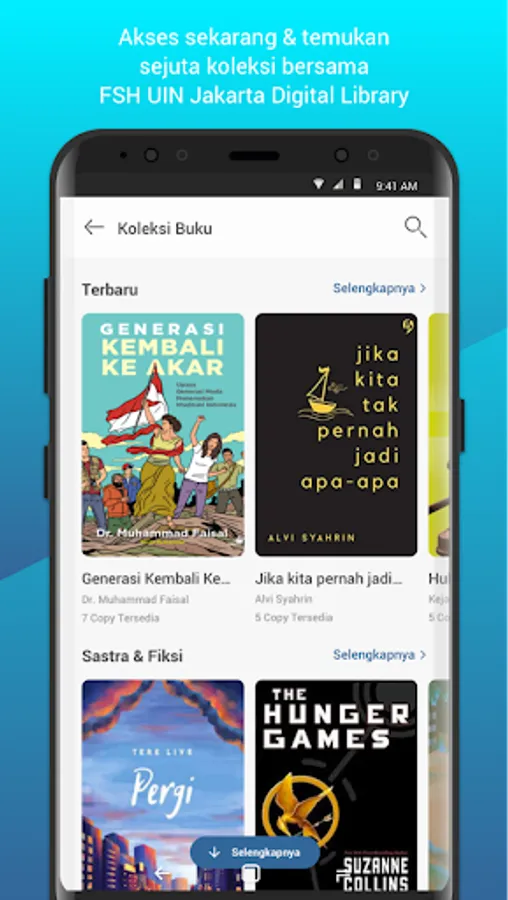 - Book Collection: This is a feature that lets you explore thousands of ebook titles available at FSH UIN JAKARTA. Choose the title you want, borrow and read with just your fingertips.