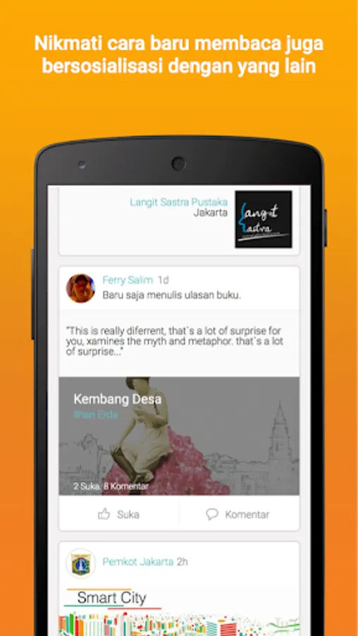 Sebagai perpustakaan digital yang dilengkapi fitur-fitur media sosial, kamu dapat menggunakan iJakarta untuk terhubung dan berinteraksi dengan sesama pengguna maupun komunitas lainnya. Kamu juga dapat memberikan rekomendasi buku yang sedang kamu baca, menyampaikan ulasan buku dan mendapatkan teman baru.
