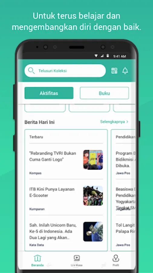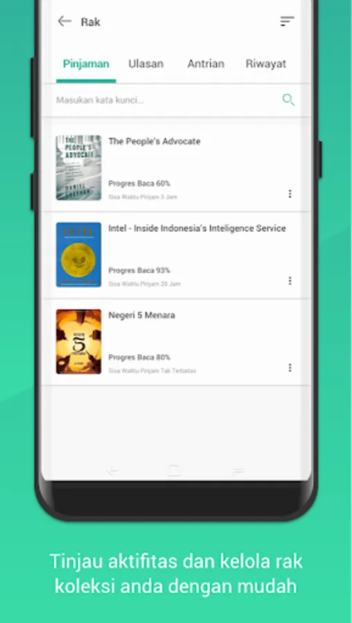- Book Collection : This is a feature that takes you to explore thousands of ebook titles in IKAPUAS. Choose the title you want, borrow and read with just your fingertips.