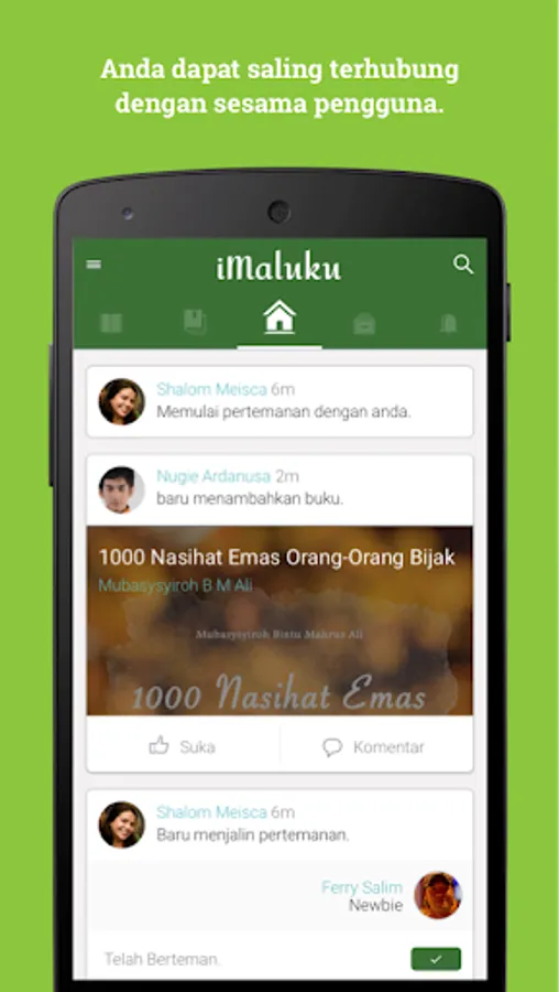 - Feed: To see all activities of iMaluku users such as the latest book information, books borrowed by other users and various other activities.