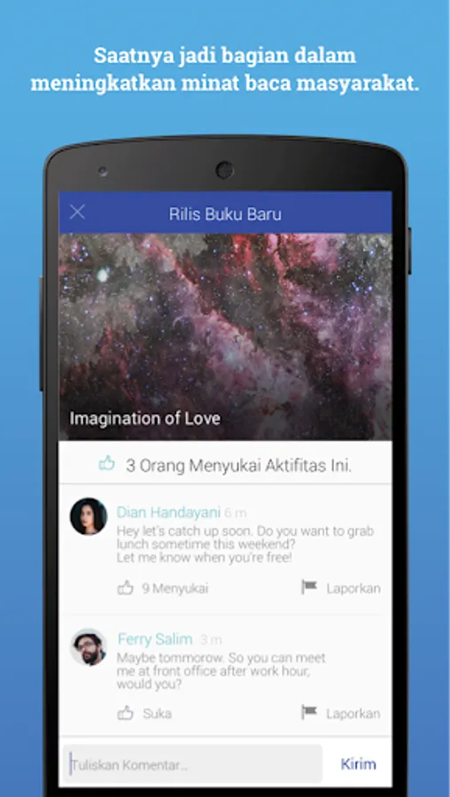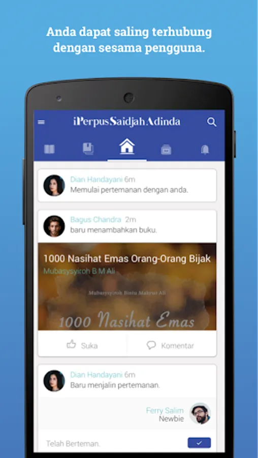 - Feed: To see all the activities of iPerpus Saidjahadinda users such as the latest book information, books borrowed by other users and various other activities.