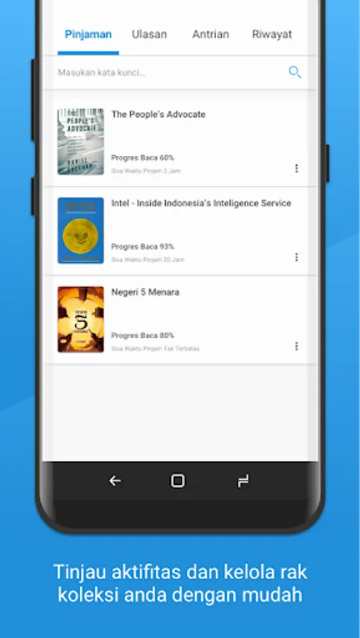 - Rak Buku : Merupakan rak buku virtual milik Anda dimana semua riwayat peminjaman buku tersimpan di dalamnya.