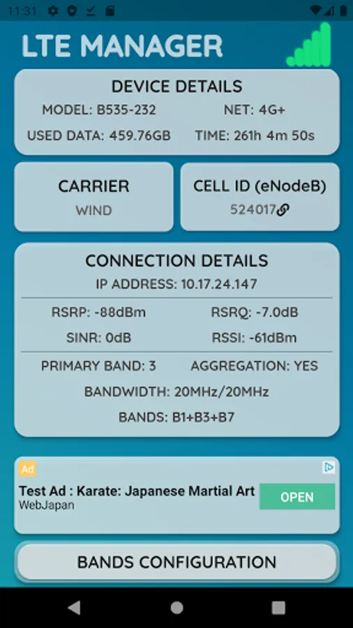 It is possible to check the values related to your connection to the BTS (Base Transceiver Station), the signal strength, monitor the real (and instantaneous) speed of the Internet connection and configure the bands (LTE) to the best.