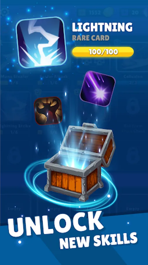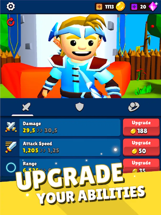 As you collect loot and skill cards, you will be able to upgrade your skills. These skills are stored within the skills panel, and there you can collect more cards and upgrade your skills. These skills bring various powers. There are two types of skills. Active skills can be equipped and used throughout the gameplay. When equipped, passive skills will help your hero without requiring any actions.