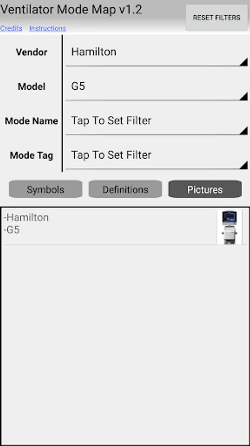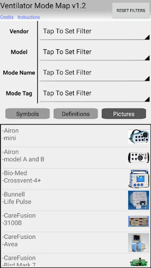 This app is designed to implement the taxonomy (classification system) for modes of mechanical ventilation described by Chatburn et al (Respir Care 2014;59(11):1747-1763). It has photographs, model names, and manufacturer names for over 35 ventilators. In this app almost 300 modes of ventilation are named and classified as described in the recent textbook: Respiratory Care Equipment by Volsko et al (Jones and Bartlett Learning, 2016).