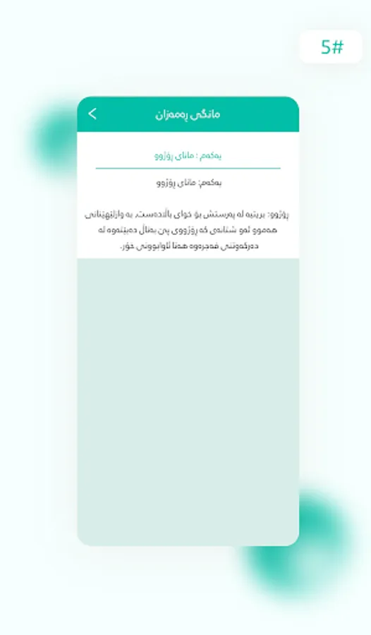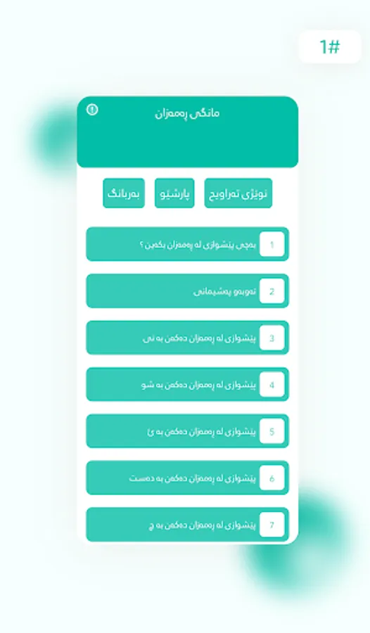 مانگی ڕەمەزانی پیرۆز کە تیایدا باس لە چۆنیەتی پێشوازی کردن لە ڕەمەزان یان زۆر شتی تر کە لە ئەپەکەیا بەردەستە وەک وەک نوێژی تەراویح پارشێوکردن بەربانگکردنەوە یان چۆن قورئان خەتم بکەین و کۆمەڵێک تایبەت مەندی تر.