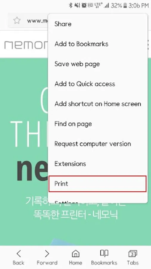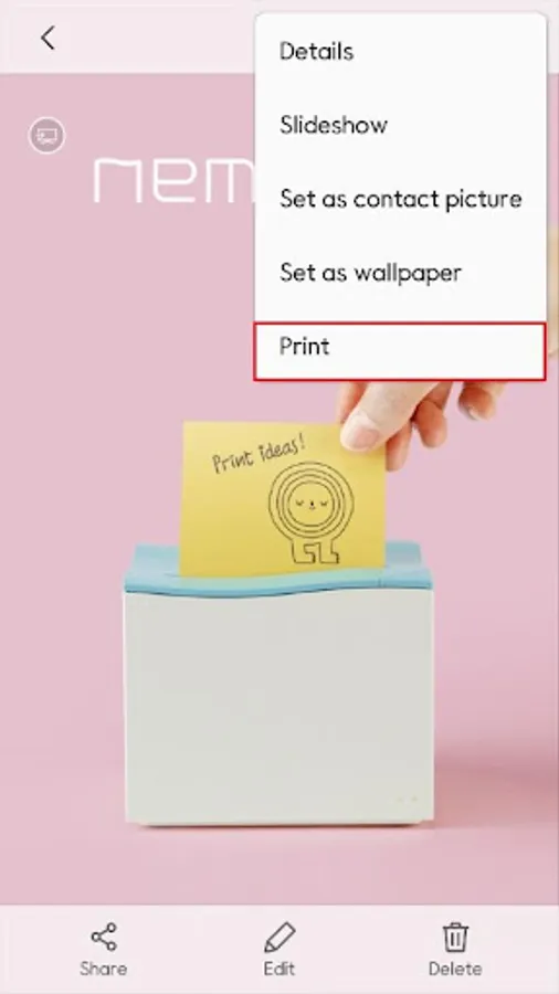 You can print to nemonic printer directly from apps like Gallery, Web Browser and Gmail which support 'Print' option using nemonic Print Service Plugin.