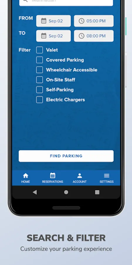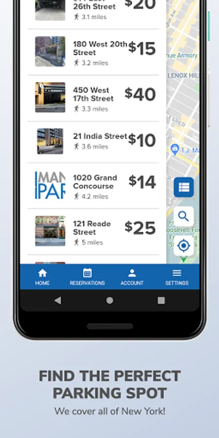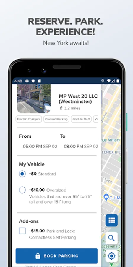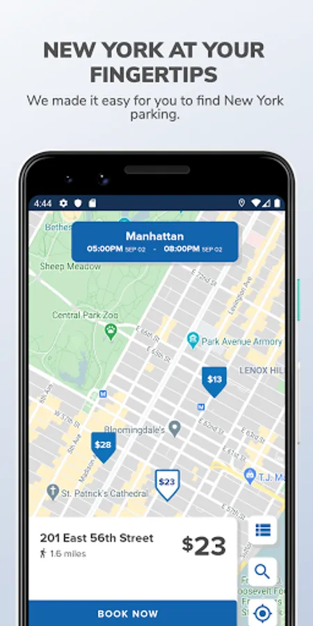 1. Search for parking near your destination. You can search by address, landmark, neighborhood and more.