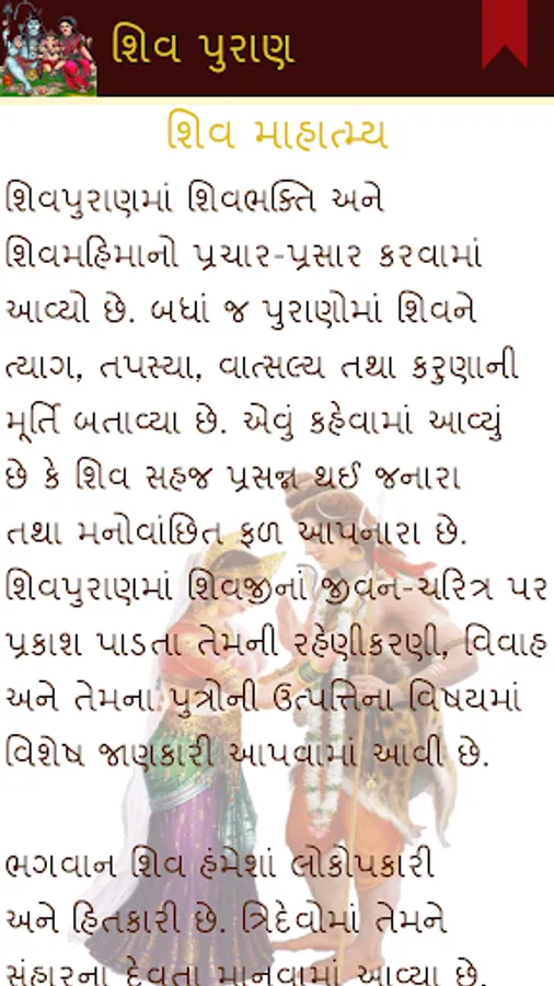 Shiv Puran in Gujarati application is collection of Shiv Puran Sanhita, Jyotirlinga kathas and Shiv Avtar Katha in Gujarati language.