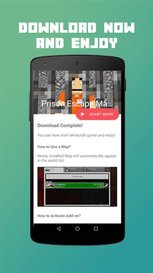 Prison Escape Map for MCPE is an application that allowed you to download and install a fully functional Prison Escape map for Minecraft Pocket Edition in just few easy step! With our 1-Click installer, you can easily get Minecraft Maps, Addons, Mods, Skins, and Texture Packs to your smartphone or tablet in only 1 single tap!