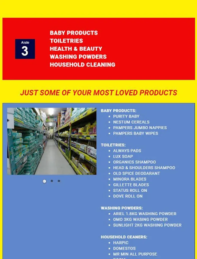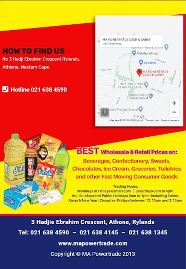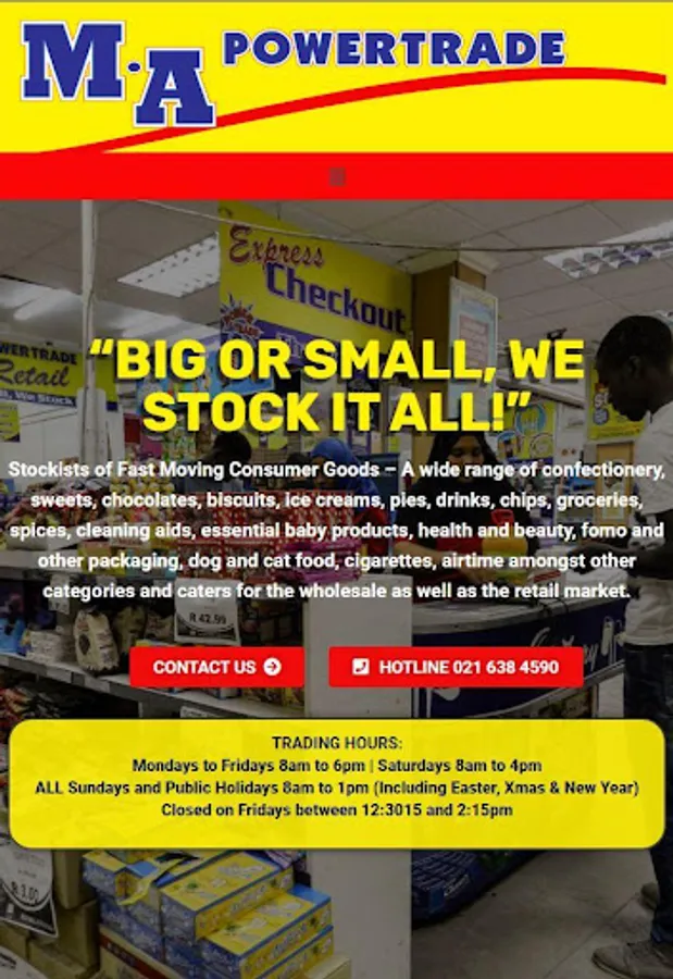 Big or Small, we stock it all! Supermarket that stocks most of all Fast Moving Consumer Goods – A wide range of confectionery, sweets, chocolates, biscuits, ice creams, pies, drinks, chips, groceries, spices, cleaning aids, essential baby products, health and beauty, fomo and other packaging, dog and cat food, cigarettes, airtime amongst other categories and caters for the wholesale as well as the retail market.