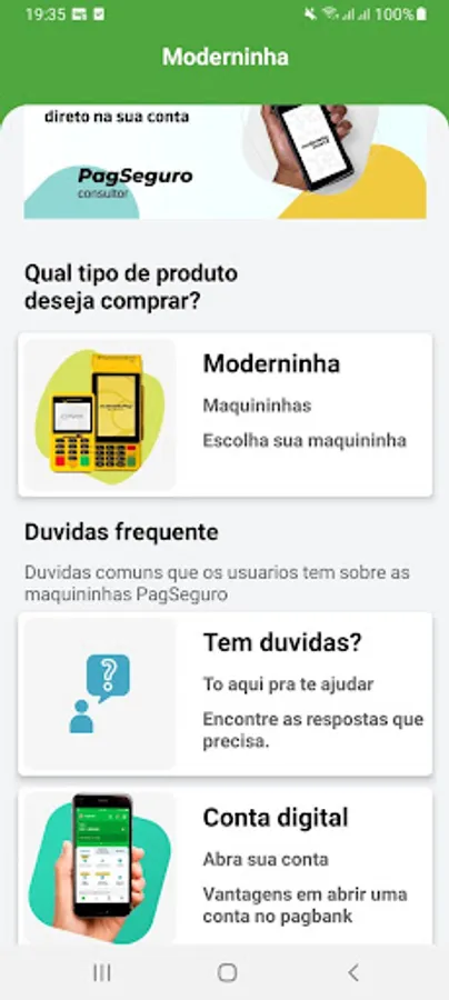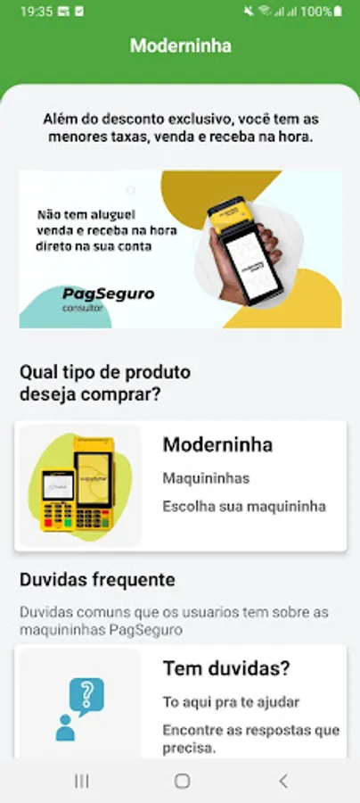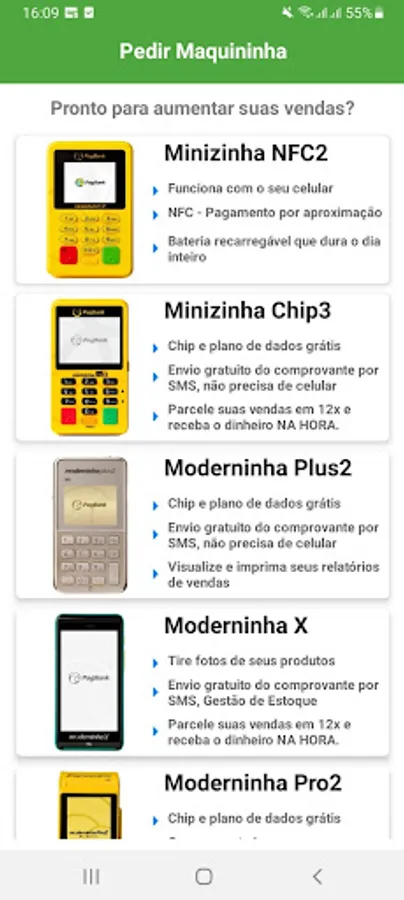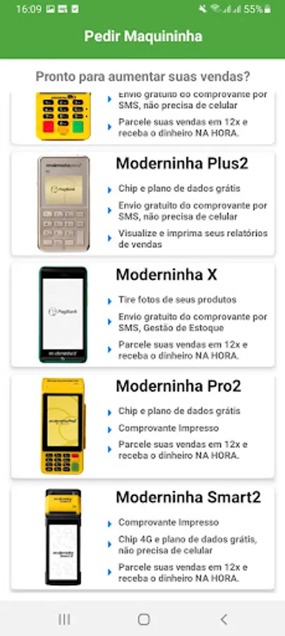 Get your moderninha or minizinha with zero fee, no rent or membership fee, 5 years warranty, free shipping, several receiving options: PIX, QR Code, all debit, credit and meal flags and you still receive money from your sales on time.