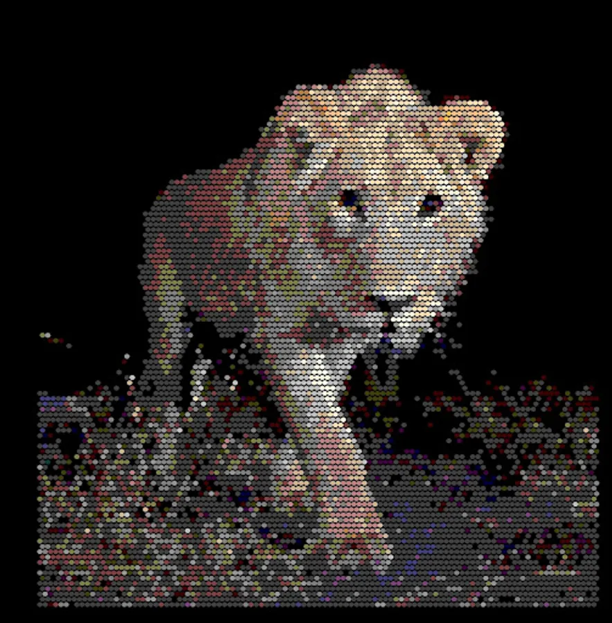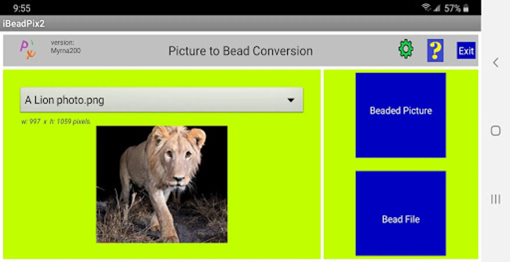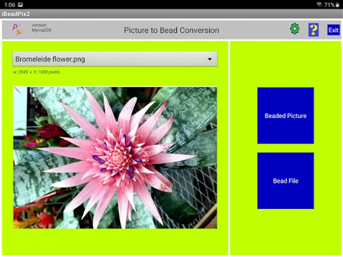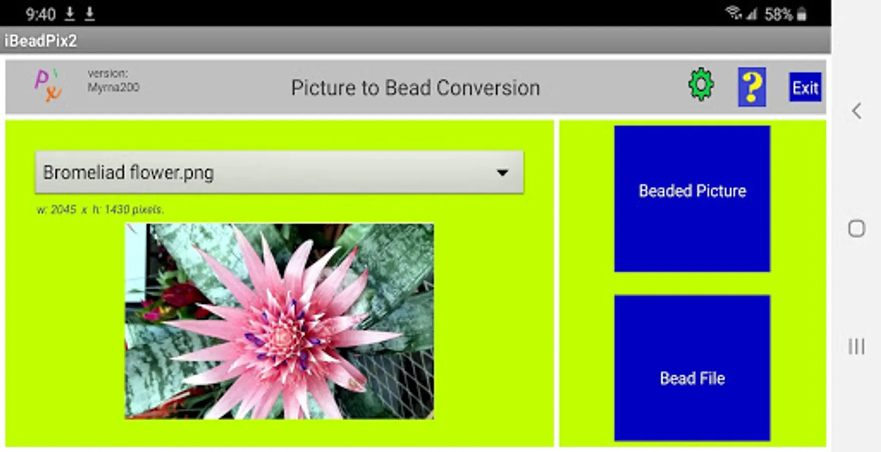 iBeadPix2 converts pictures (.jpg or .png files) to peyote beading patterns. You can pick from 2 to 132 colors for beads in the beaded pattern. You can specify the shape of beads in the display (either rounded rectangle or circle) and the size of bead in the display (four sizes). You have a choice of the approximate number of beads you want in the pattern (eleven choices from 2,000 beads to 24,000 beads). You can pick the background color for gaps between beads to make viewing/beading the pattern easier.