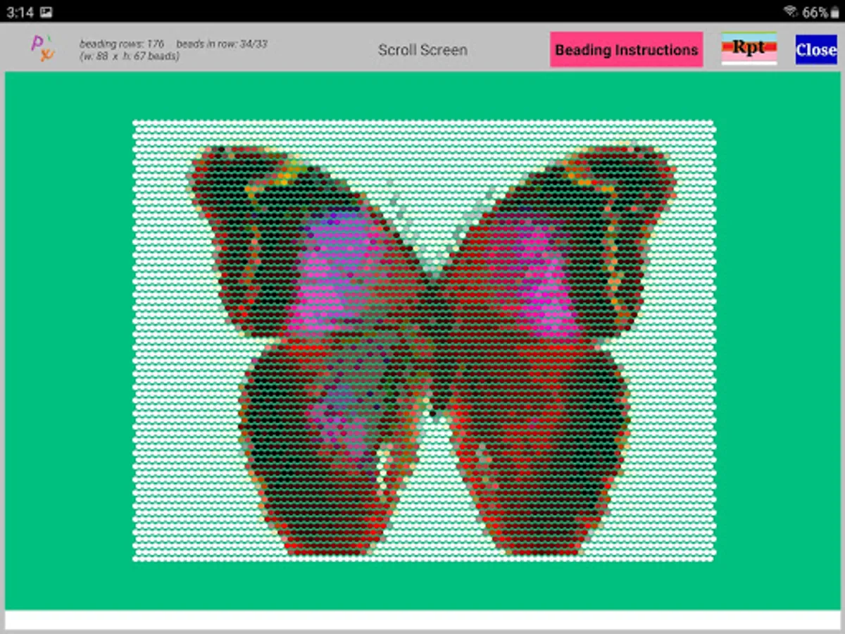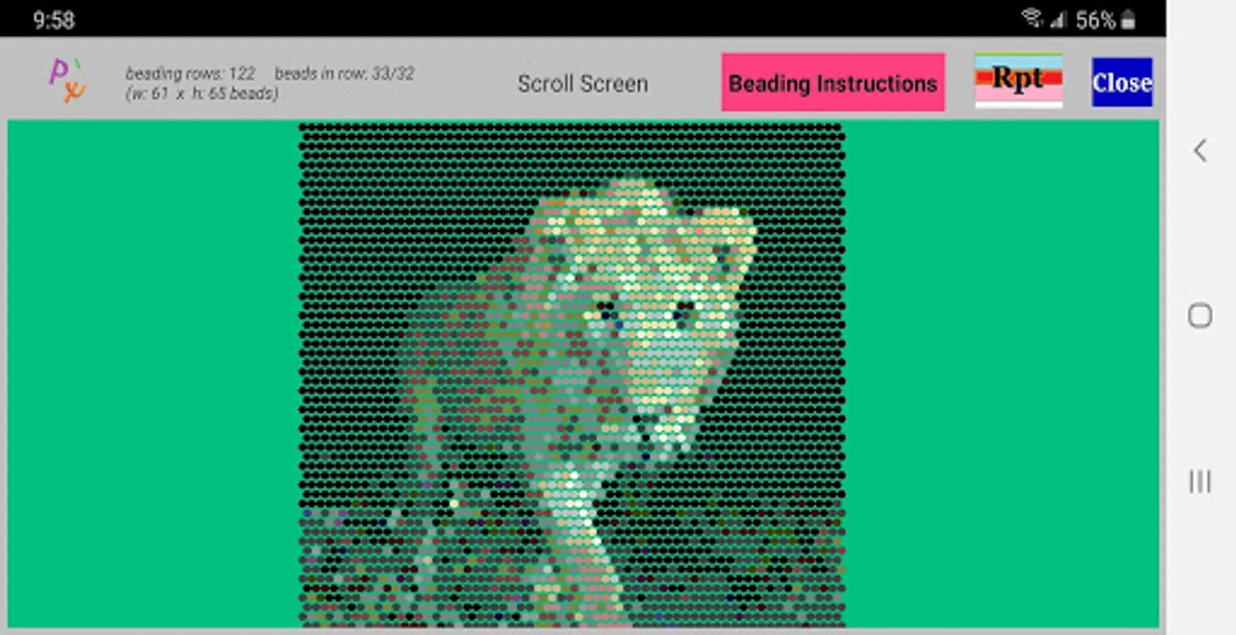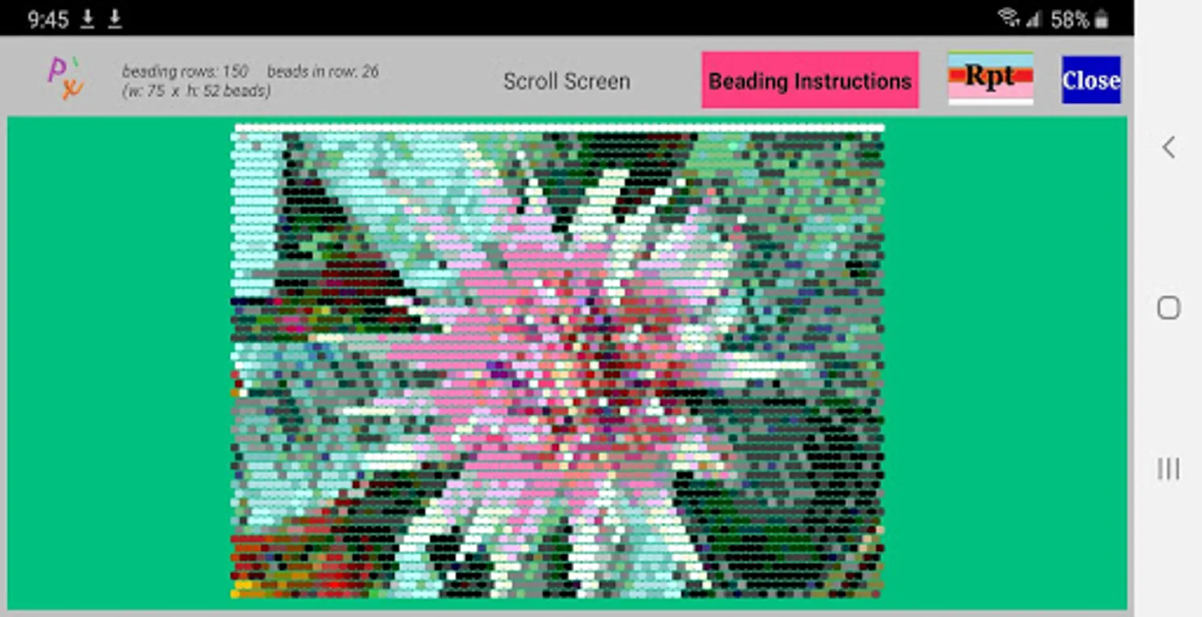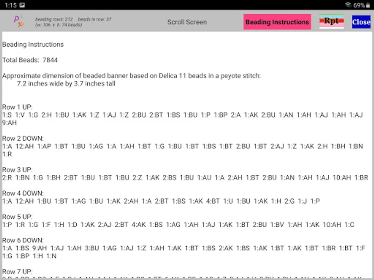 The app displays the beaded pattern, a color report of the number of beads of each color in the pattern with a color code, and a full set of beading instructions beading-row by beading-row using the color code.