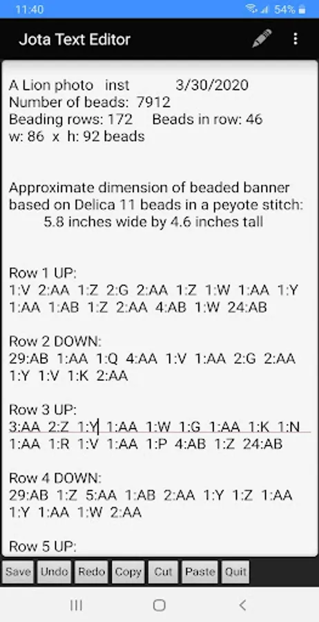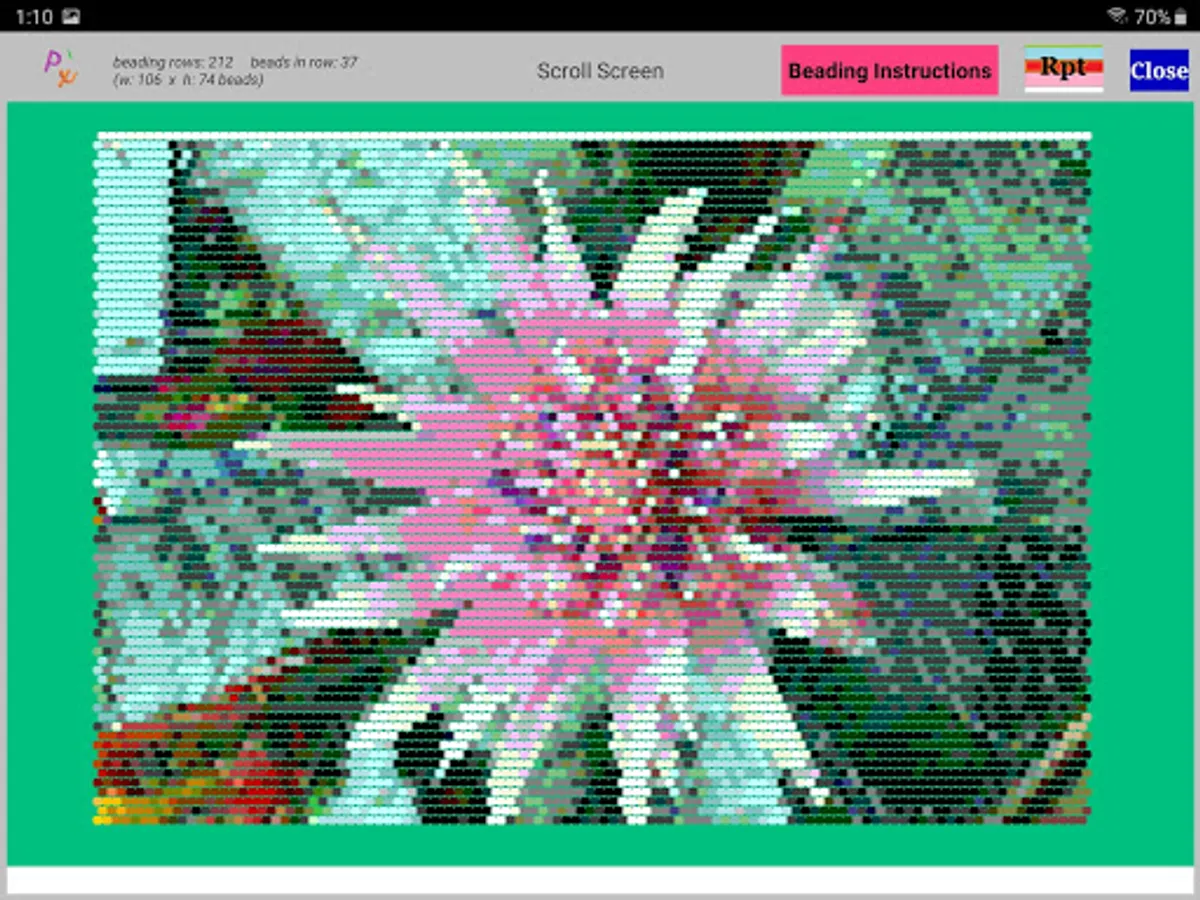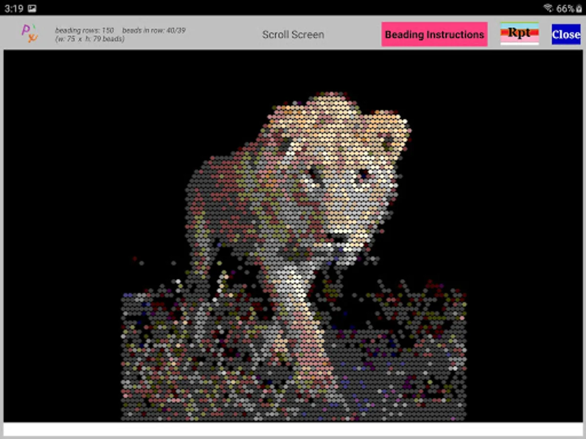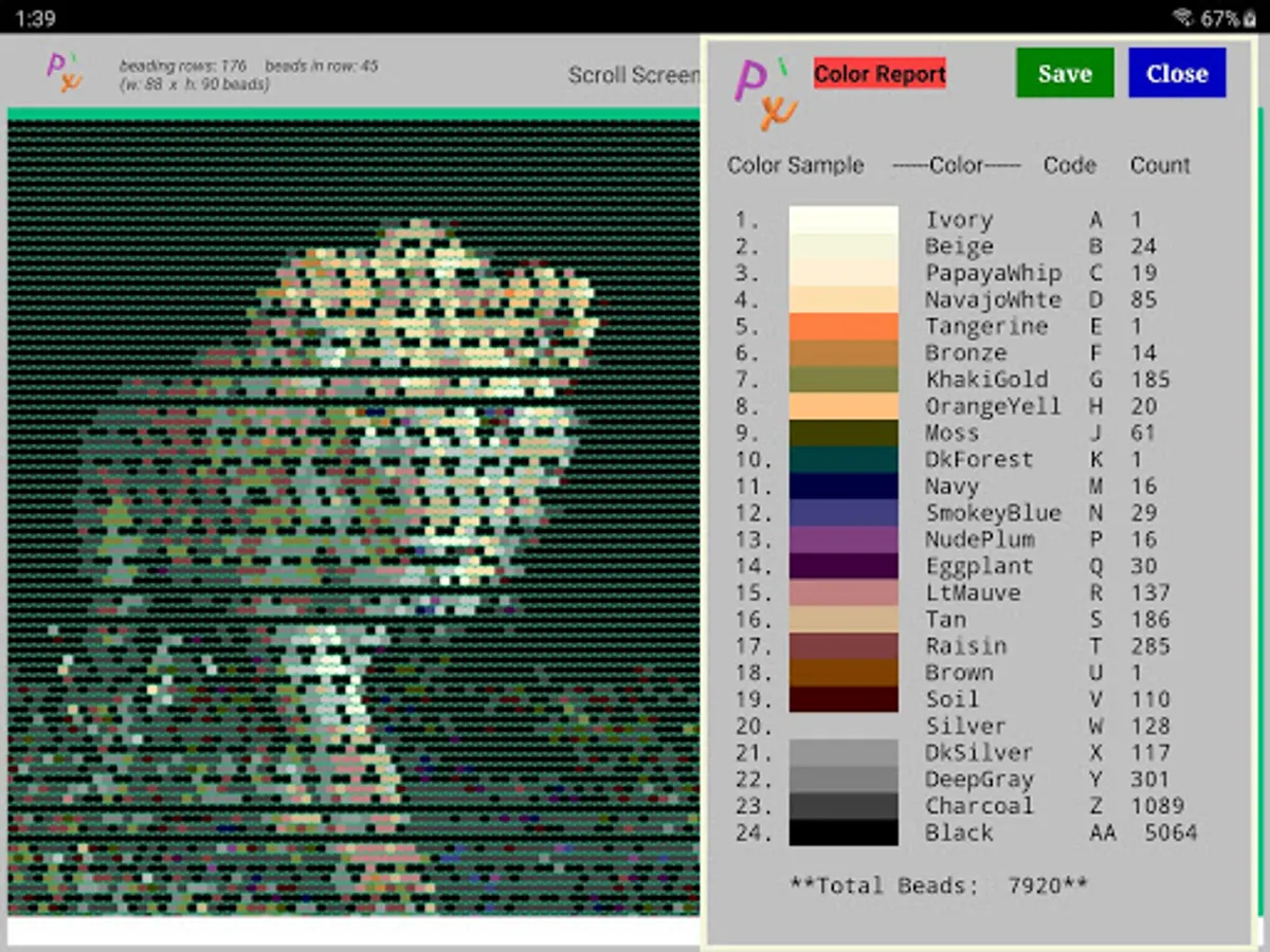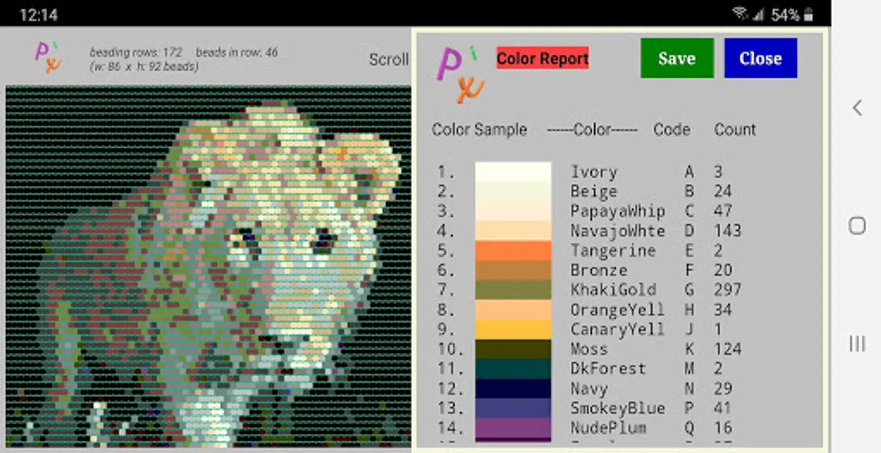 The app displays the beaded pattern, a color report of the number of beads of each color in the pattern with a color code, and a full set of beading instructions beading-row by beading-row using the color code.