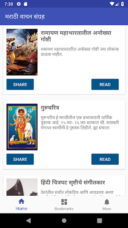 This app has over 100 Marathi books absolutely free and offline so once you install this app you will not need internet to use it. The books include books by Ambedkar, Sane Guruji, Tukaram and by many new and upcoming authors.