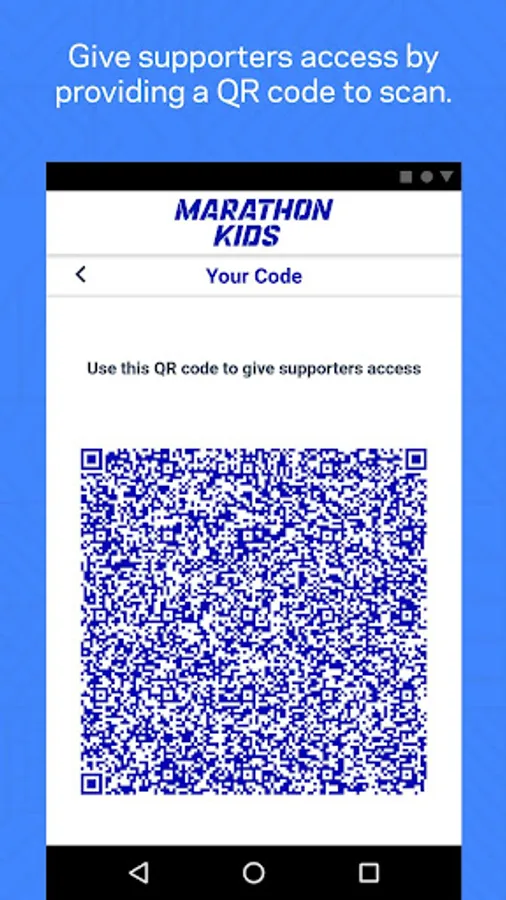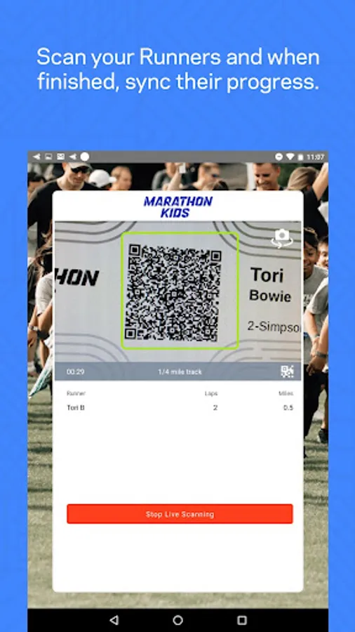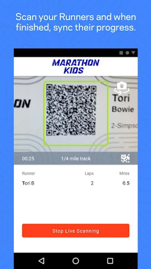 At Marathon Kids, we firmly believe that incorporating physical activity into each day is key to a child's health, wellness, and ability to learn. This scanning app is designed to simplify the job of measuring and tracking laps with a fast-scanning QR code reader; the companion platform on desktop helps you manage your program, with easy access to leaderboards, impact reports, resources, and more.