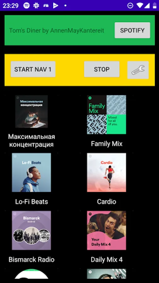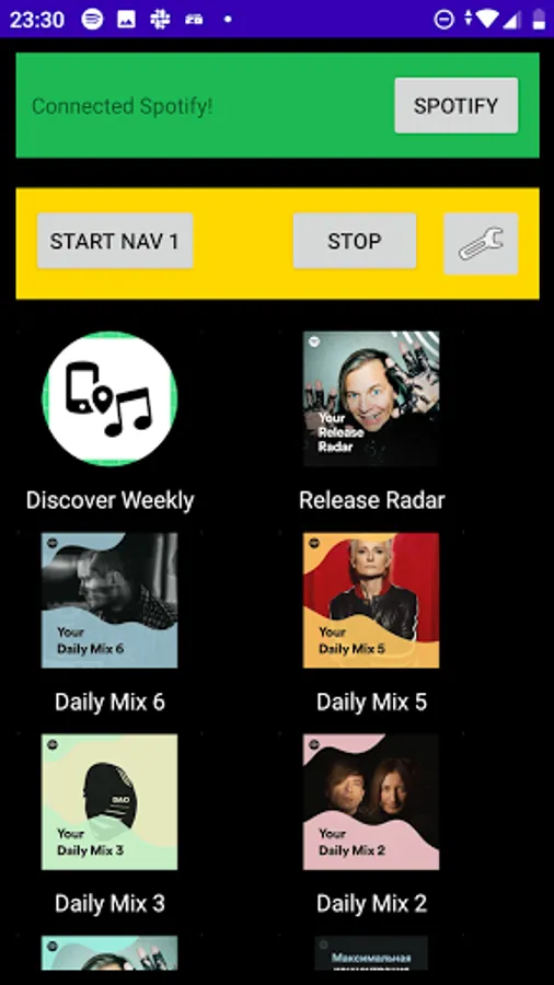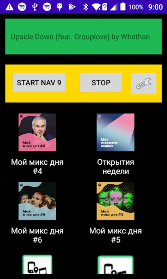 My app starts spotify, waites before spotify will be ready playing, starts playing last song and after run spotify app or navigation app. (you can select one time)
