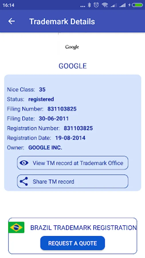 With this App you will be able to search for all trademarks that have been filed or registered with the Intellectual Property Office of Brazil. This App is perfect for start-ups, entrepreneurs, marketers, lawyers, and anyone else who often finds themselves in the need to check previous trademark records. The App is completely free and allows to search by trademark name, trademark number and trademark owner’s name. The trademark name search support identical and similarity modes and also, if needed, you can filter results by class number. The App also has a trademark class search engine, so you can search for the class that your product or service belongs to. Brazil Trademark Search App Overview: