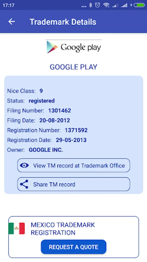 With this App you will be able to search for all trademarks that have been filed or registered with the Intellectual Property Office of Mexico. This App is perfect for start-ups, entrepreneurs, marketers, lawyers, and anyone else who often finds themselves in the need to check previous trademark records. The App is completely free and allows to search by trademark name, trademark number and trademark owner’s name. The trademark name search support identical and similarity modes and also, if needed, you can filter results by class number. The App also has a trademark class search engine, so you can search for the class that your product or service belongs to. Mexico Trademark Search App Overview: