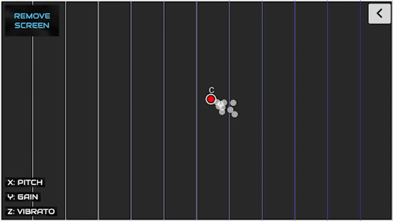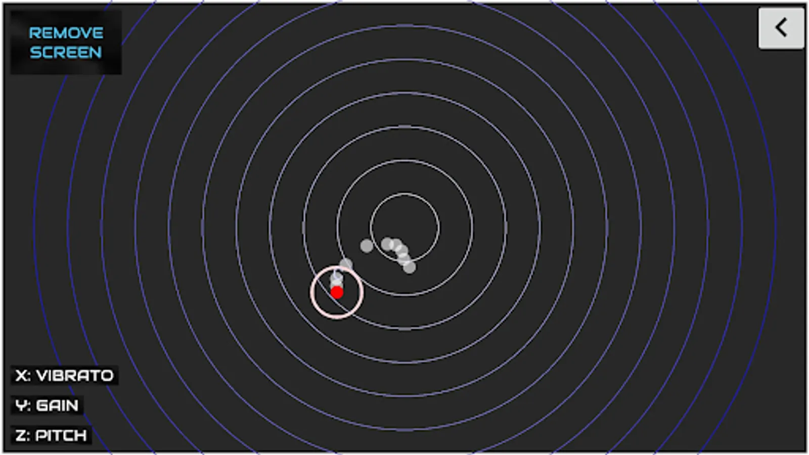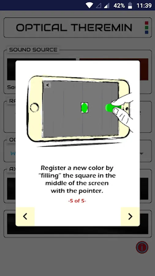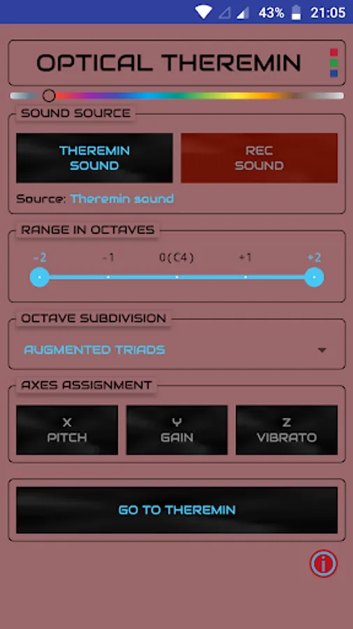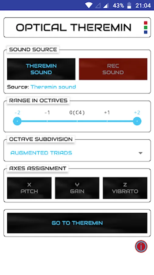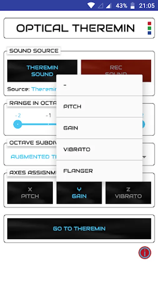 Assign sound parameters to the three spatial axes (x, y and z). Then hold something colorful or wear it on your fingertip (e.g. a thimble, a pencil or a bottle cap). The Theremin will follow it so that you can change pitch, gain, vibrato, and flanger parameters with a simple gesture. You can also record any sound that you wish to control with your finger.