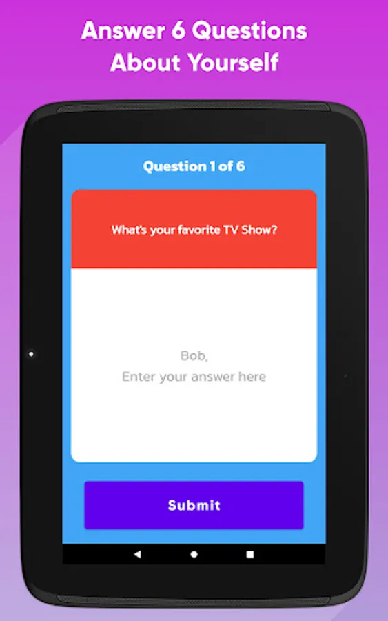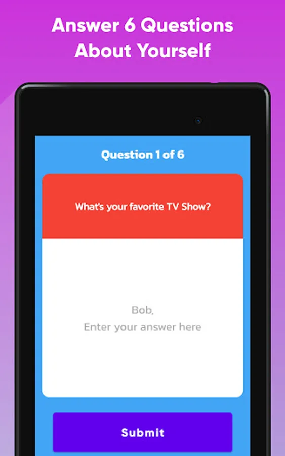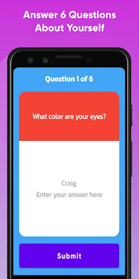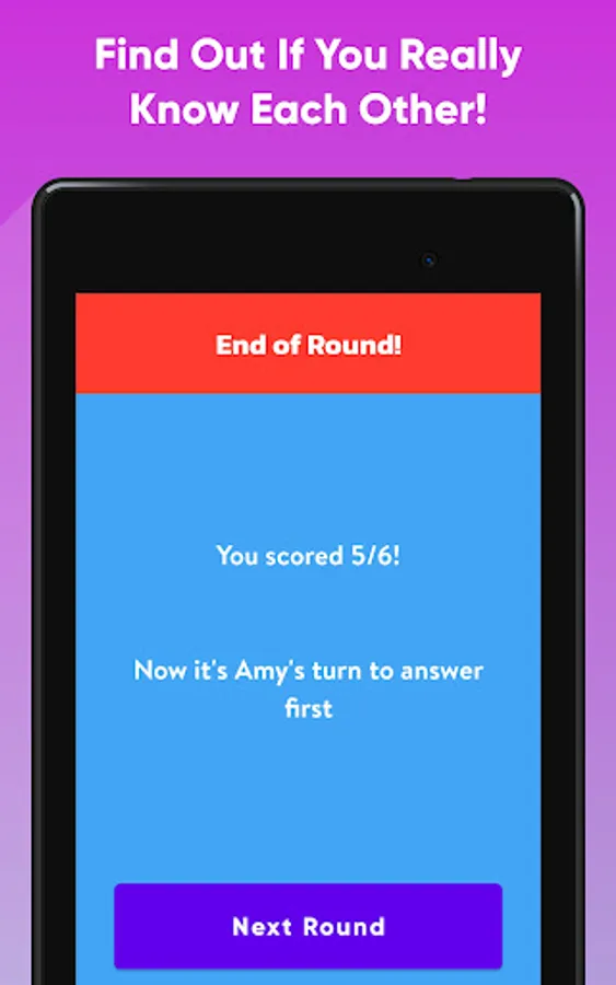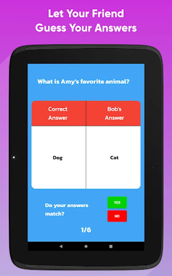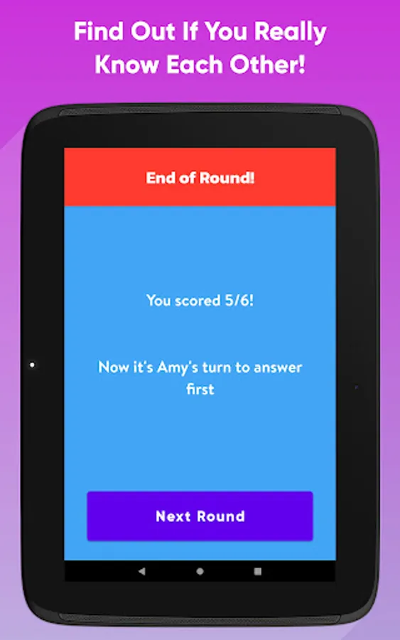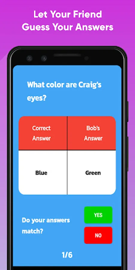This game is designed for both players to play on the same device. The first player answers 6 questions about themselves and then the second player must try and guess their answers. At the end find out how well you both know each other.