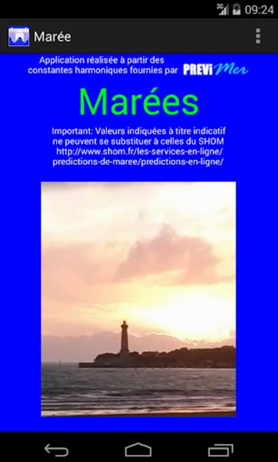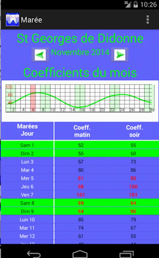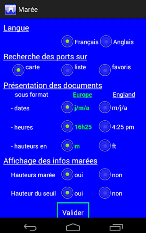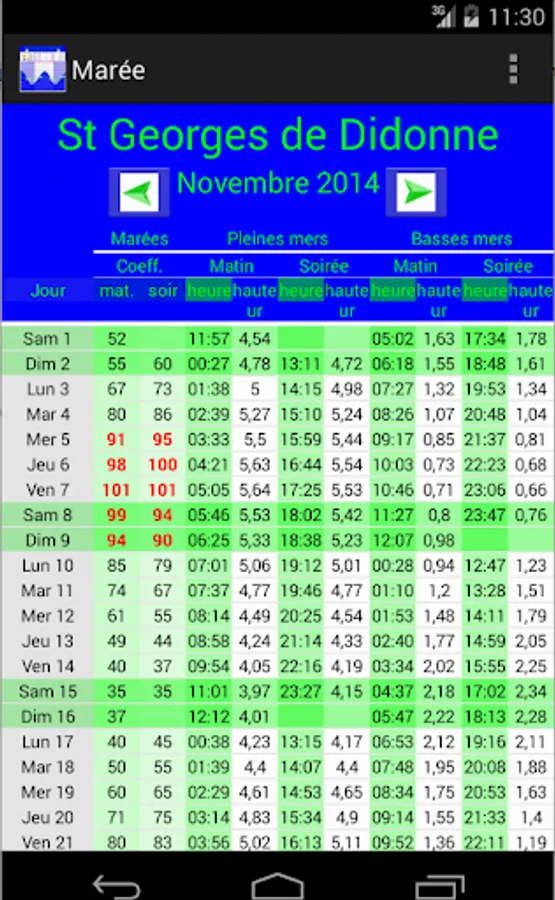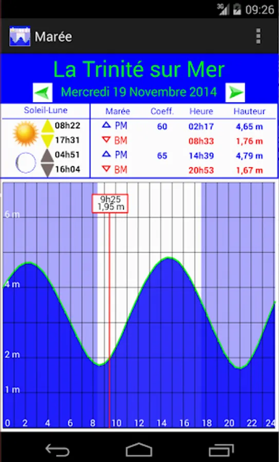 Times, heights and tidal coefficients over 150 French ports and a few ports in Britain.