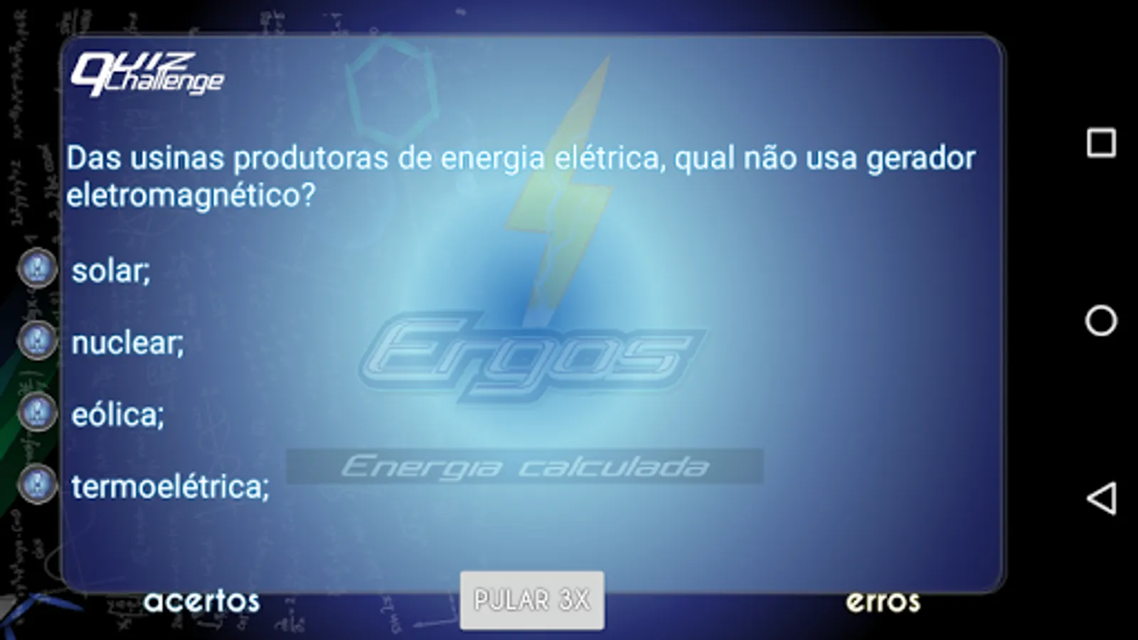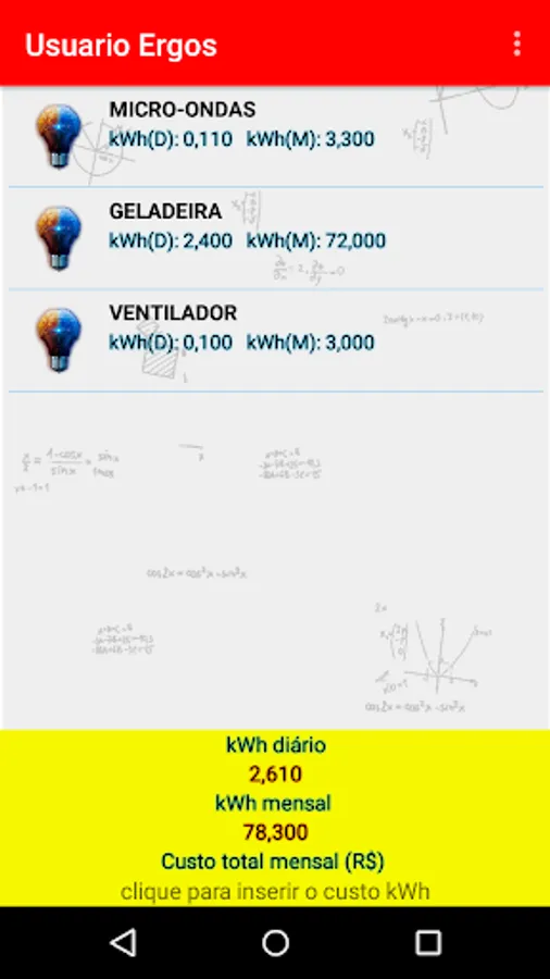 The Ergos: calculated energy is an application for Android operating system, which runs on version 4.1 or higher, for teaching the calculation of electricity consumption by equipment that has the power supply this type of energy. It also aims to stimulate discussion on the rational use of electricity.