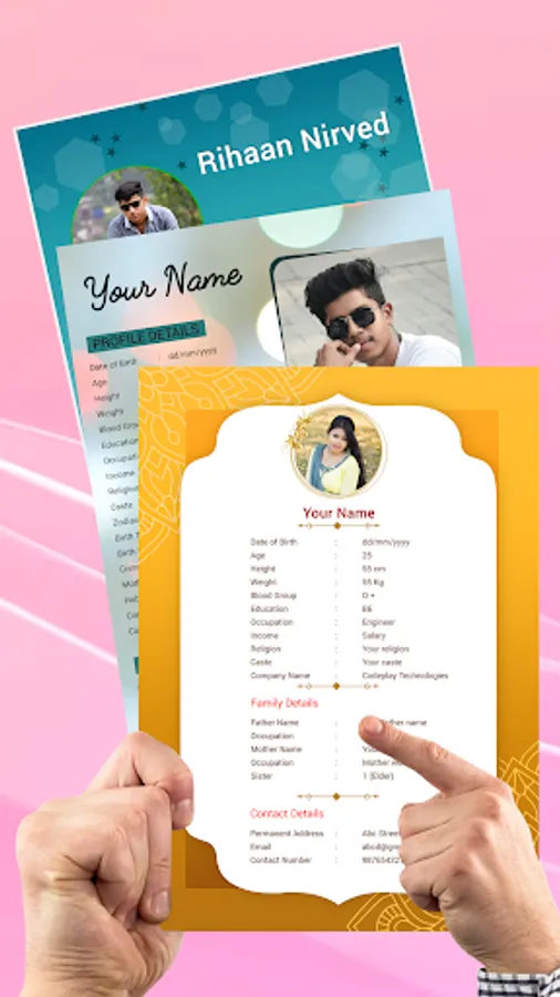 Biodata app for marriage means you can use our app for making professional profiles in pdf format. Earlier everyone use normal paper and pen, then they write the wedding profile details on that paper and then transfer them to the other couple biodata. It is a long process. But now it is very simple, we have more than 40 marriage templates on this marriage proposal app. Just give your marriage details in this marriage biodata maker tool then simply select your template, you can see the awesome magic, your marriage profile details are automatically created and shown in pdf file format, then you can download it for later reference or share directly it to other parties.