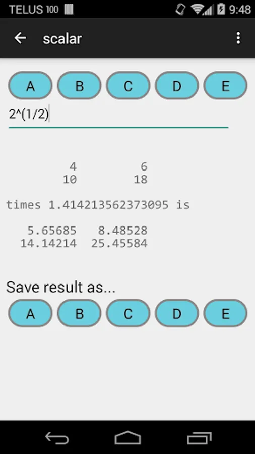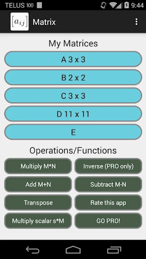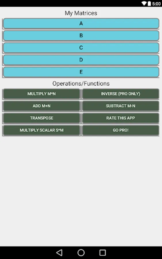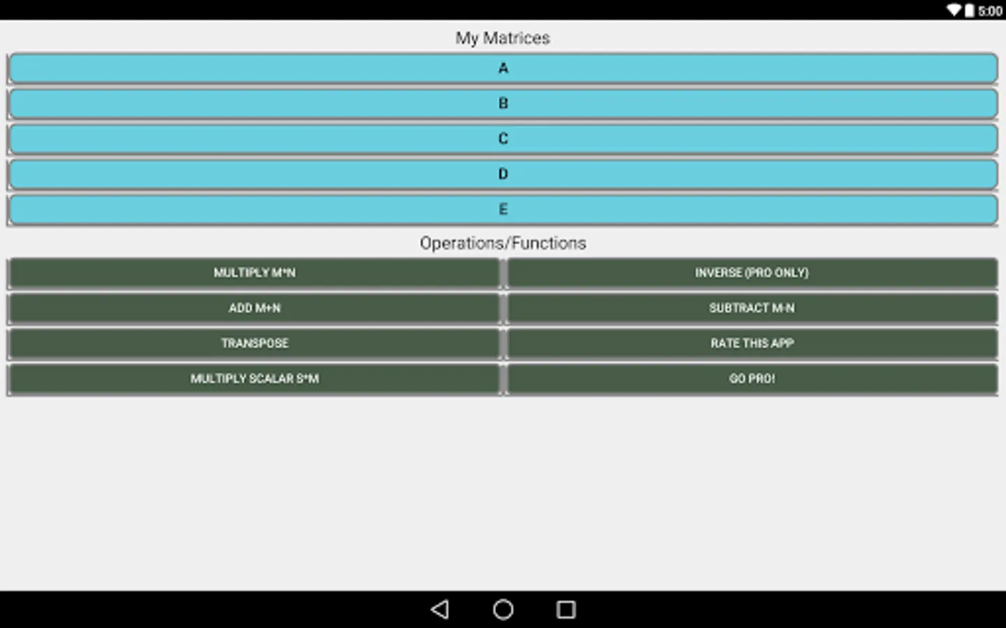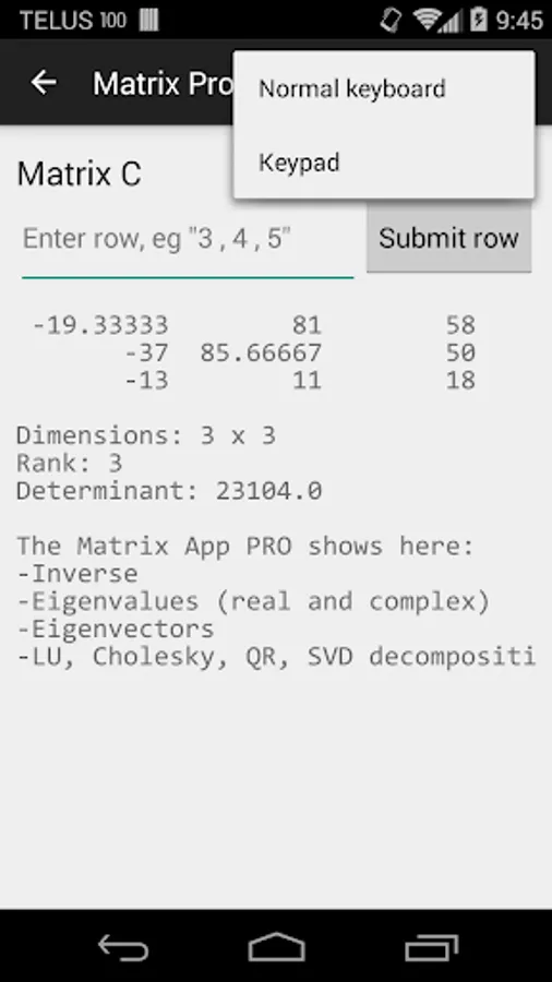 With the paid version of this app, The Matrix App PRO, also compute the inverse, eigenvalues (real and complex), eigenvectors, and find LU, Cholesky, QR and SVD decompositions.