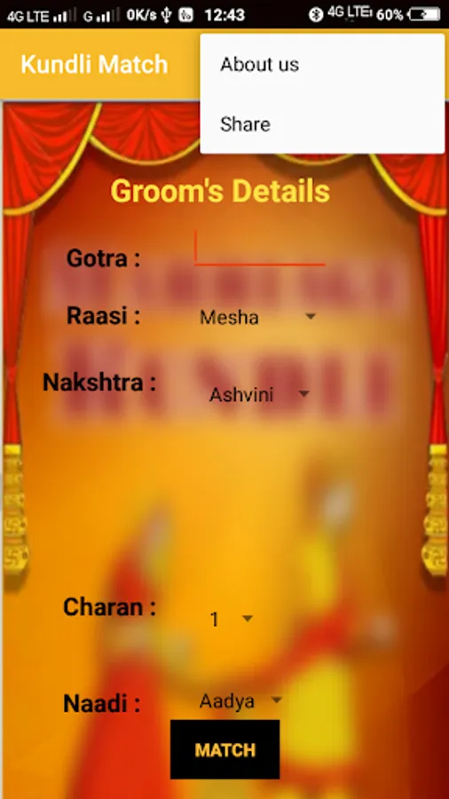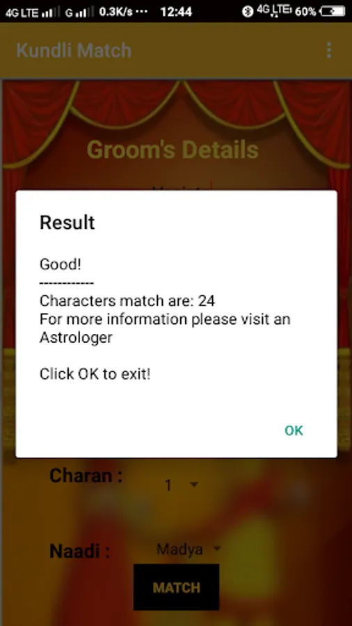 Please note this does not based on check the Mangalik and all. It checks the number of characters matches based on the bride and grooms Nakshatra and Raasi. For detailed Kundali matching and results you should meet the astrologer.