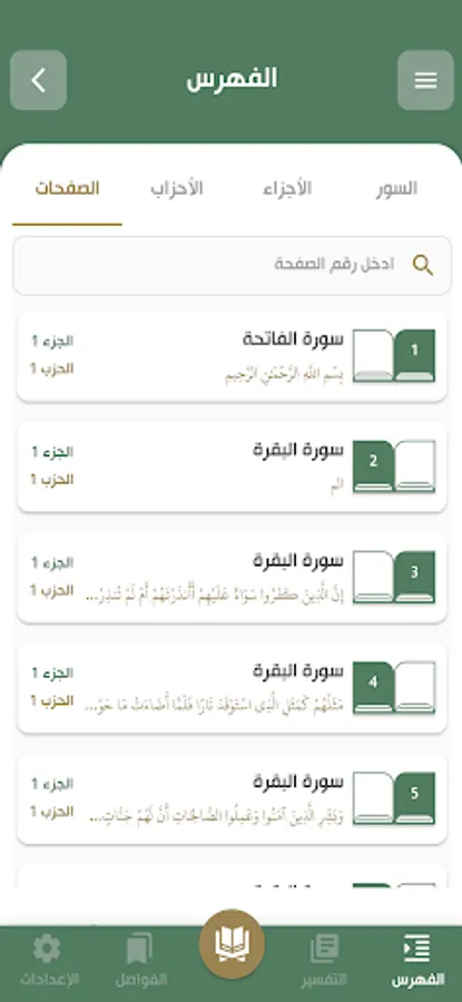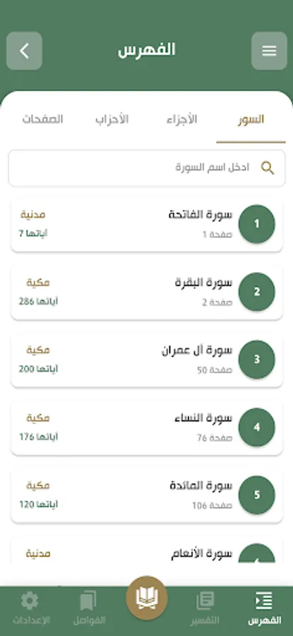 Index of all the surahs of the Noble Qur’an, with parts and parties -