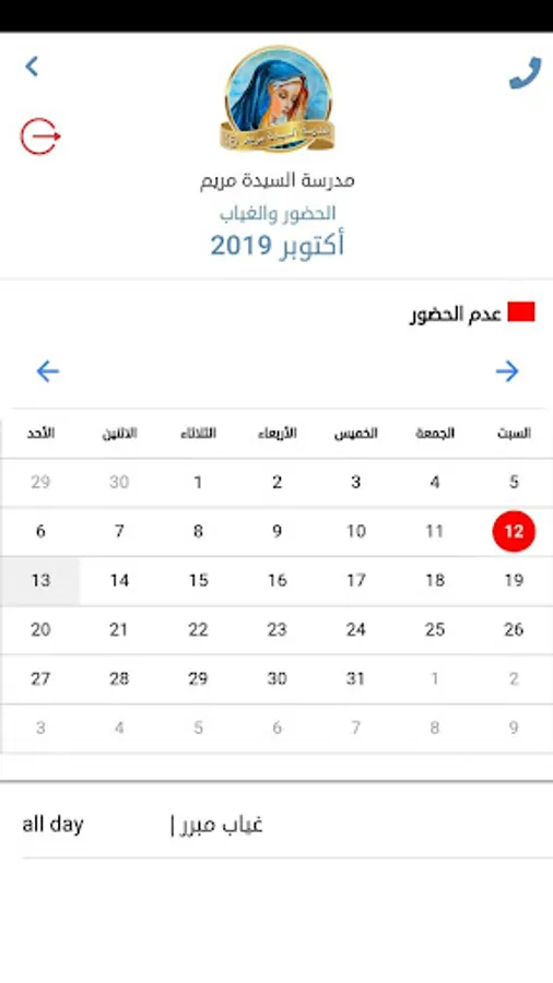 (Attendance and Absence): This feature allows parents to see the schedule of absence of their children during each month with the reason for the absence and justification