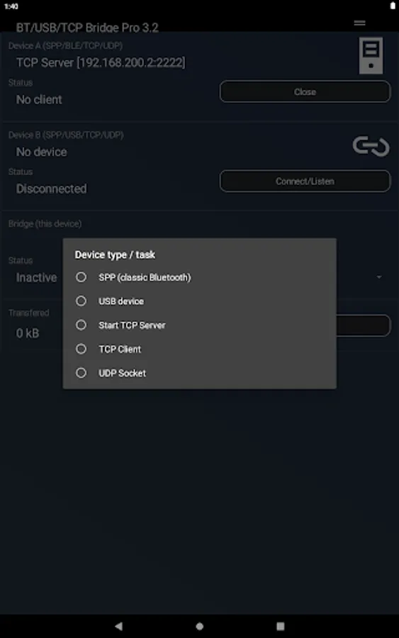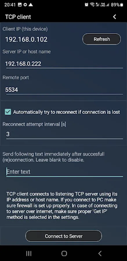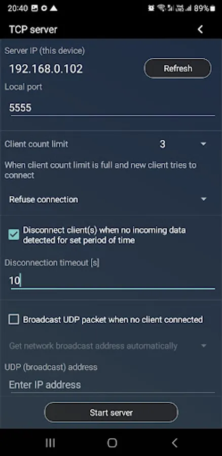 - TCP server : app can create listening TCP server socket to which you can connect up to 3 clients
