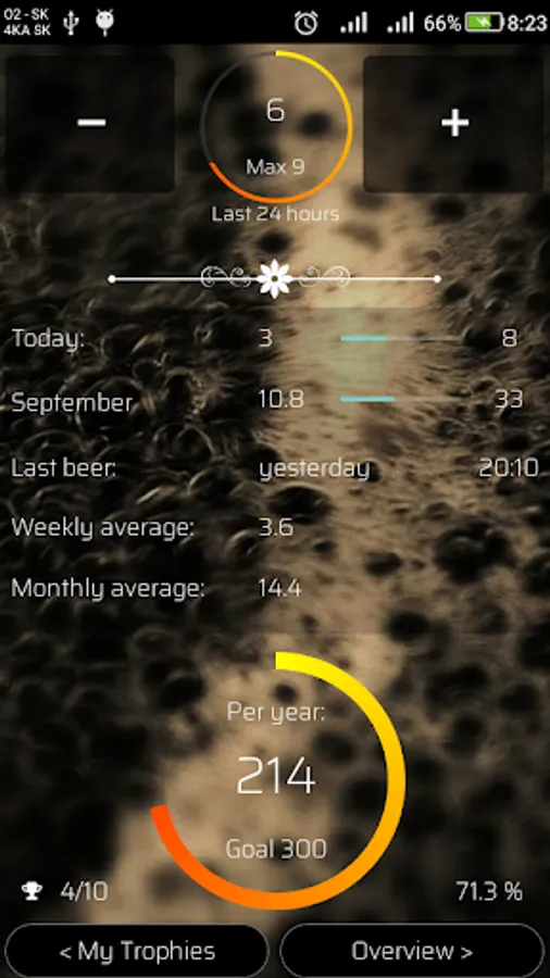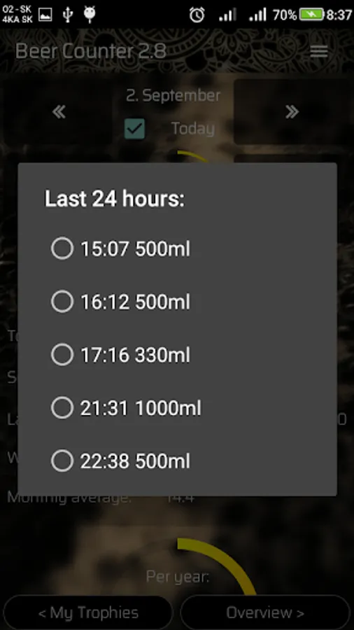Each beer you add with 'today checkbox' checked is automatically stored in 24 hour history. To show this history, click on the circle progress bar in the middle. Time for each individual beer added in past 24 hours is listed. This list is being constantly updated.
