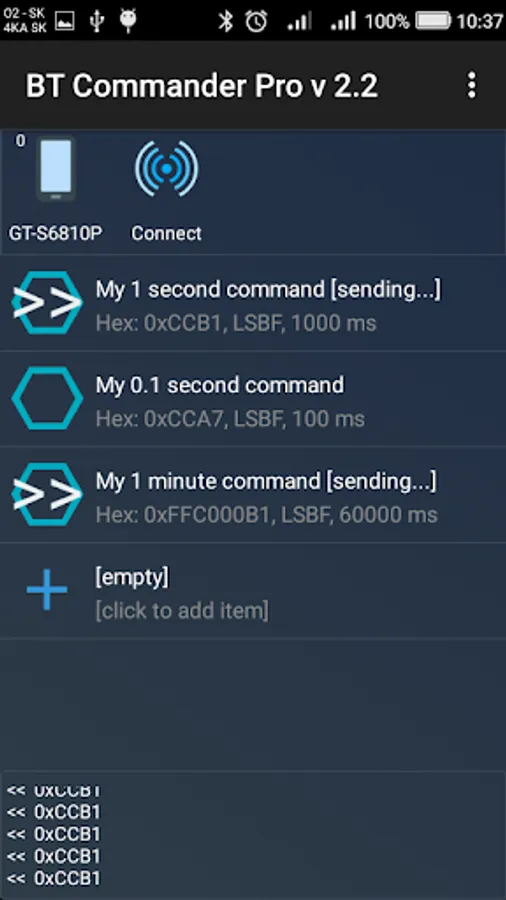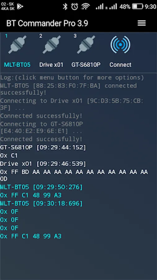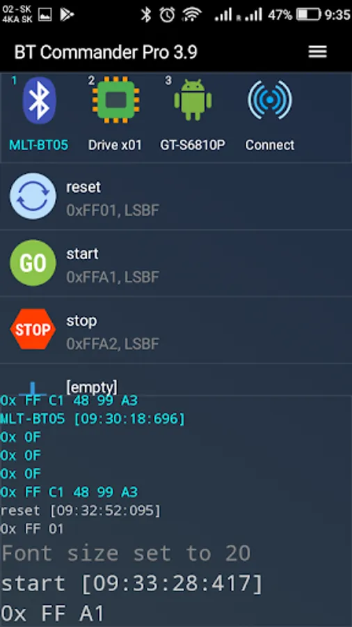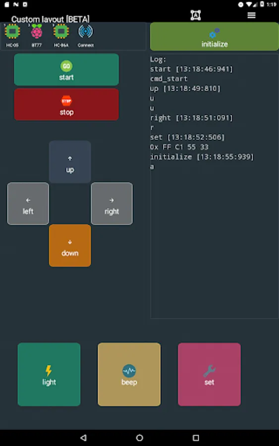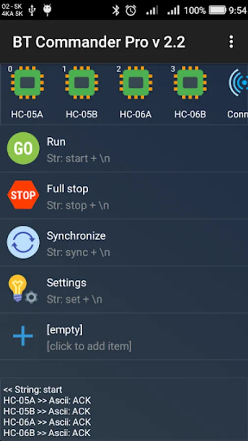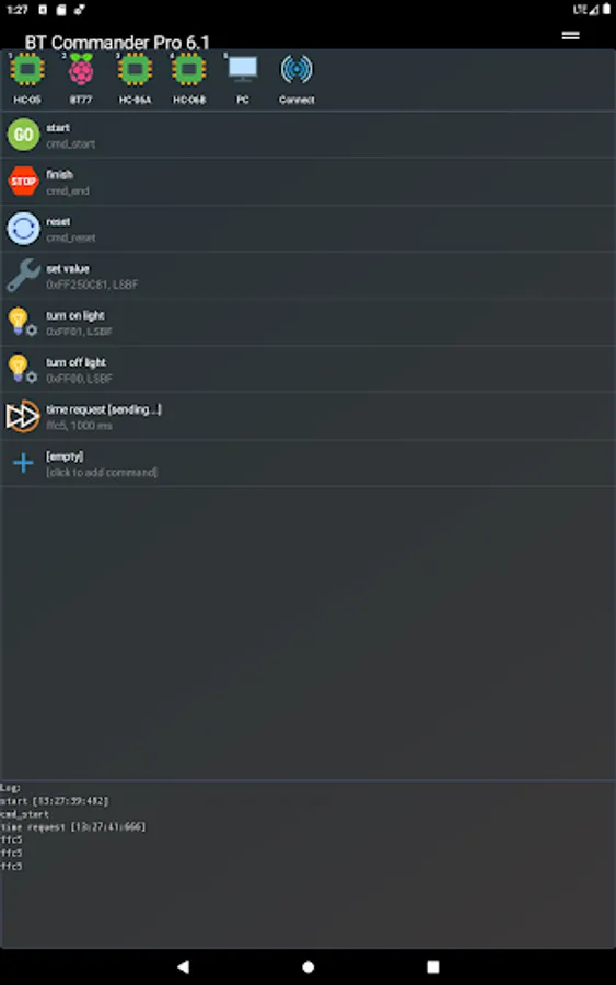 Bluetooth Commander is Bluetooth terminal app for managing low level communication between your Android smartphone and Bluetooth devices (one or multiple) such as microcontrollers, Arduino, processor boards or other Bluetooth terminals. Application allows simultaneous connections to multiple devices with traffic diagnostic functions and contains interface for creating database of user defined commands. From version 6.8 [currently available for beta testers] phone sensor data such as GPS position, acceleration, temperature, battery level, proximity, etc., can be included in commands and send to connected devices.