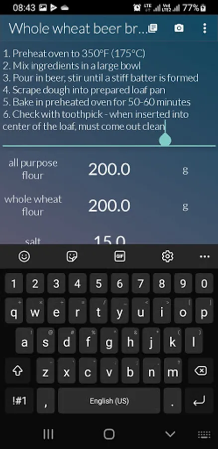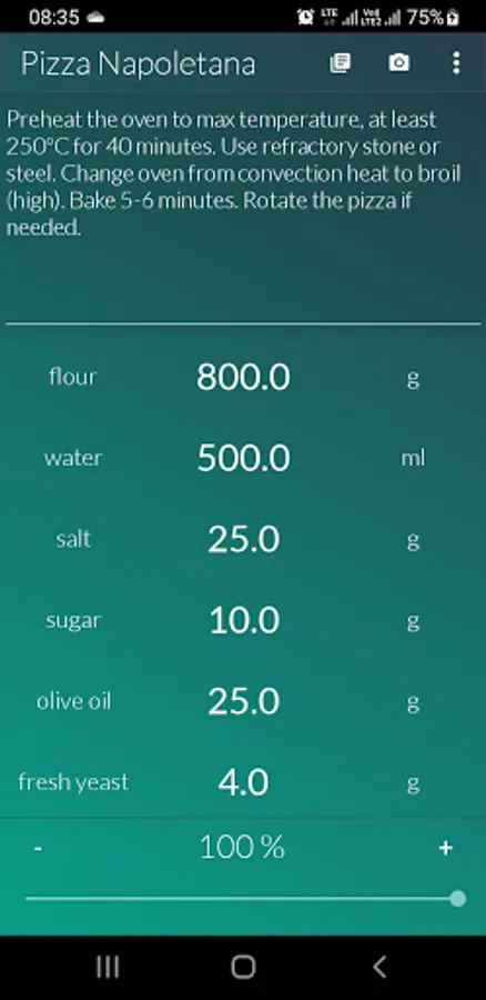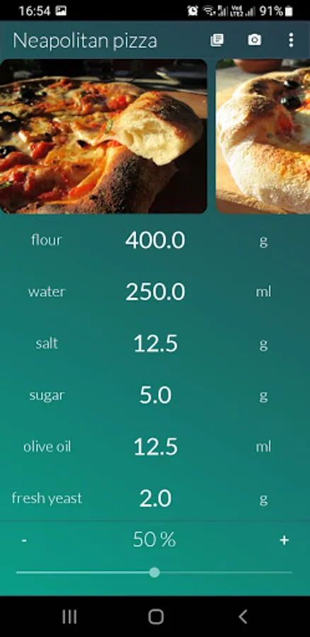 Store your recipes in one place and get your ingredients recalculated instantly just by swiping your finger. Enter all recipe ingredients and set desired percentage value - values of all ingredients will be recalculated instantly. You can also store notes (e.g. instructions) and images for your recipes.