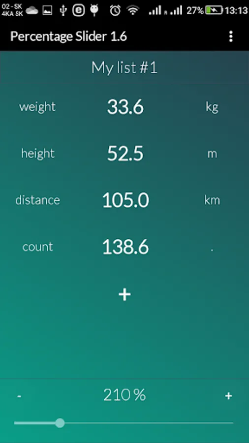 However, app is not limited to only recalculate ingredients portions, but basically any value in your list. You can define custom unit for each value (such as kg, ml, oz, cm, inch... etc) and custom name to easily identify each value. Everything is saved as you exit the app.