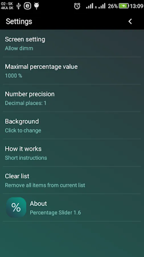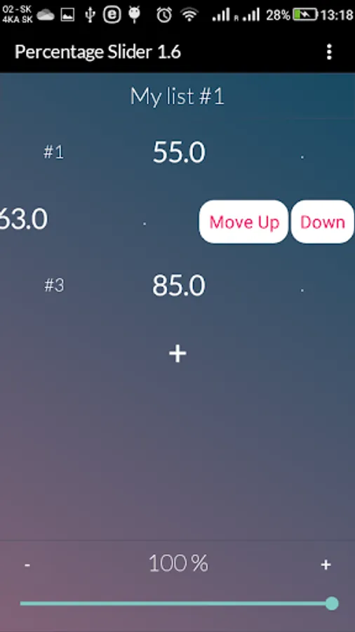 All values are updated as you move your finger across the screen. It`s that simple. All values can be instantly edited and changed any time. If you want to reorder your list, swipe item to the left and reveal "up" and "down" buttons. Swipe item to the right to remove it from the list.