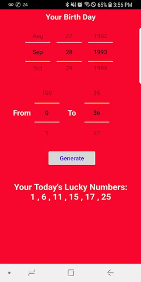 This app will generate your six lucky numbers every day based on your date of birth using a very complicated and secret Algorithm