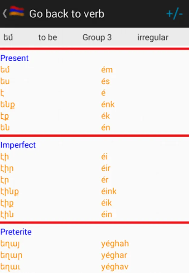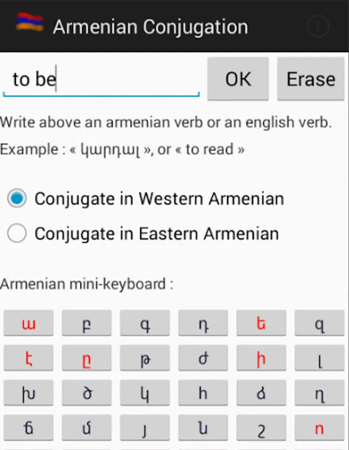 Armenian Conjugation is a free tool for beginners, it permits you to conjugate automatically an armenian verb (western armenian or eastern armenian). Moreover, about 550 translations are available, so it is also possible to write an english verb to get the armenian conjugation ;).