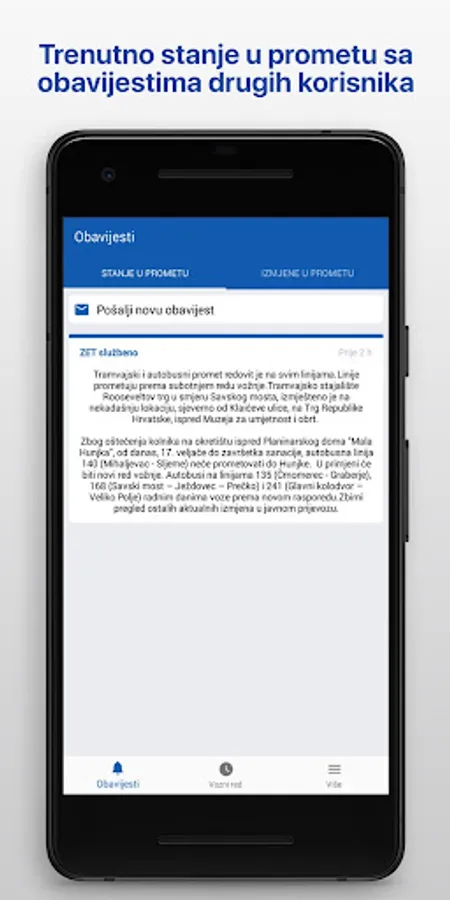 Find out in time about changes and extraordinary regulations in ZET traffic with the ZET info application. If there is an extraordinary regulation of ZET traffic, the application will send you a warning.