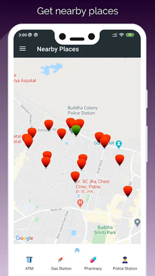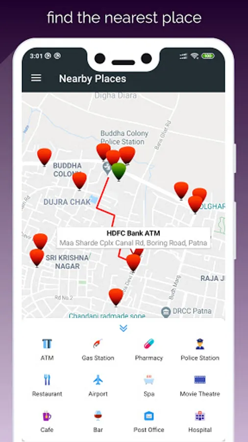 You can also search nearby places like ATMs, gas stations, spa and many more. And by tapping the marker you can find out path, distance and travel time to that place.