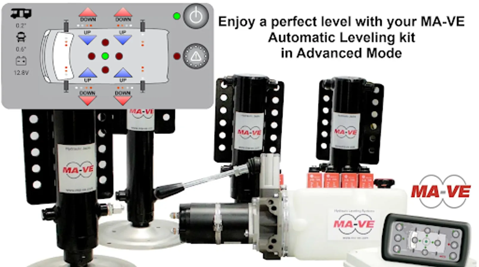 Thanks to this MA-VE app it is possible to perform the automatic cycle of our leveling kit with a tap on the touch screen, and will also to perform any manual mode operation from your smartphone or tablet, for example to replace a tire quickly and effortlessly, or to completely empty the tanks. To have a stable and well-levelled motorhome while parked is the dream of every motorhome owner. Your sleep will be much better and the motor home won’t move when you do. Pots and pans will not slide away from the hob and the fridge will always light. The MA-VE automatic levelling system will offer you all these and the combination of price and quality will surprise you. Designed and produced taking care of every tiny detail. We have taken into account the best quality, comfort, reliability and performance, putting this system at the top of its category. It uses an electro-hydraulic pump and features a hand lever to retract the “feet” even in case of a power failure.