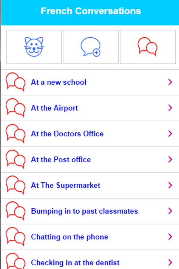 This app contains vocabulary , phrases and Conversations to teach how to be fluent in English , French , Spanish .