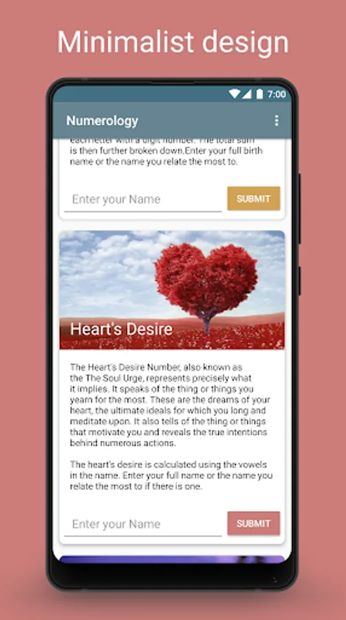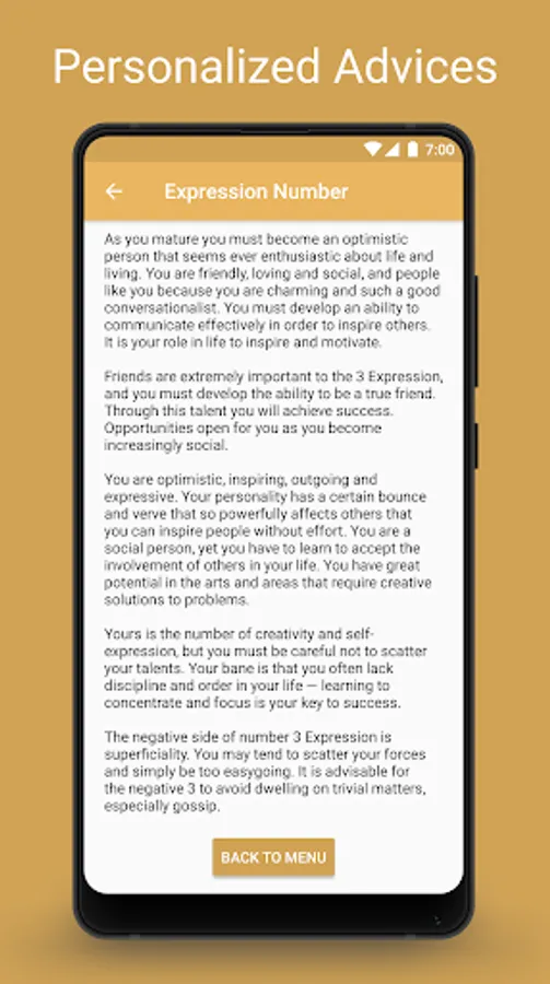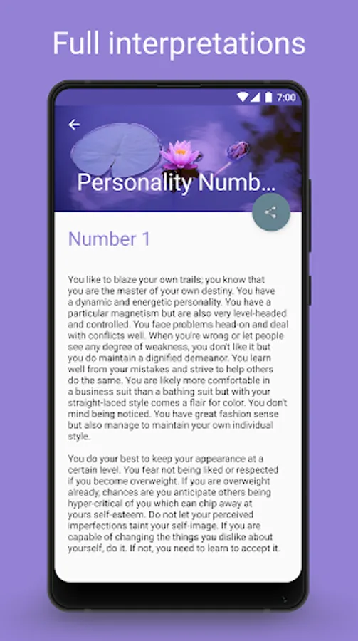 This app has above all an interest in entertainment. Numerology is a controversial science whose validity has never been demonstrated. Do not take too much to heart the results you could get and keep in mind that you alone are the master of your life and what you can do.